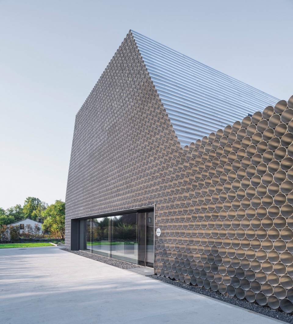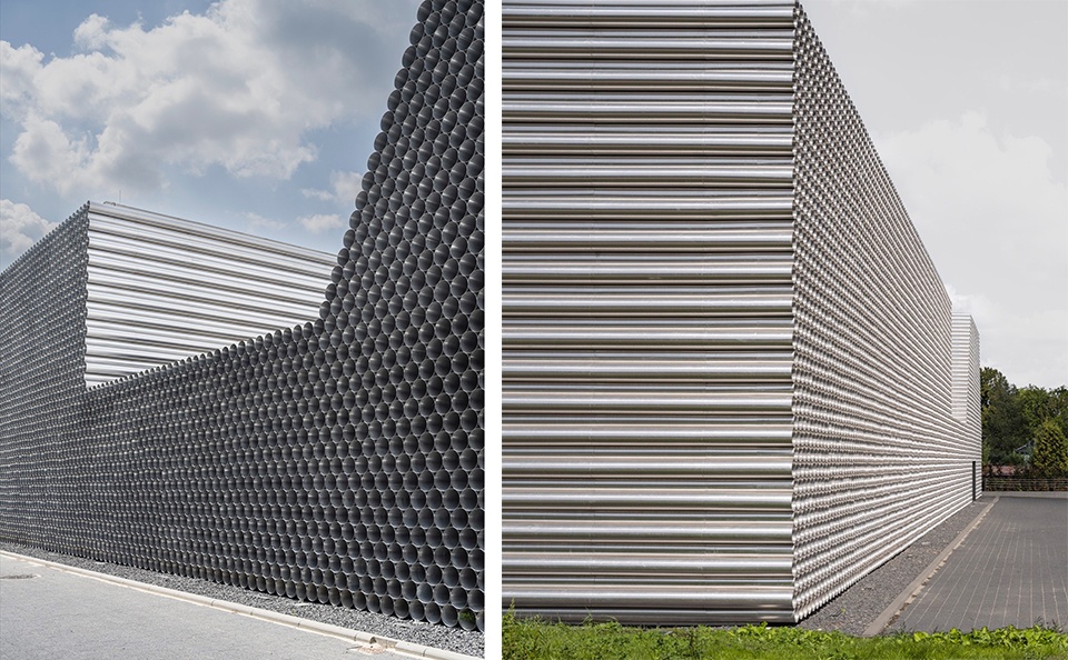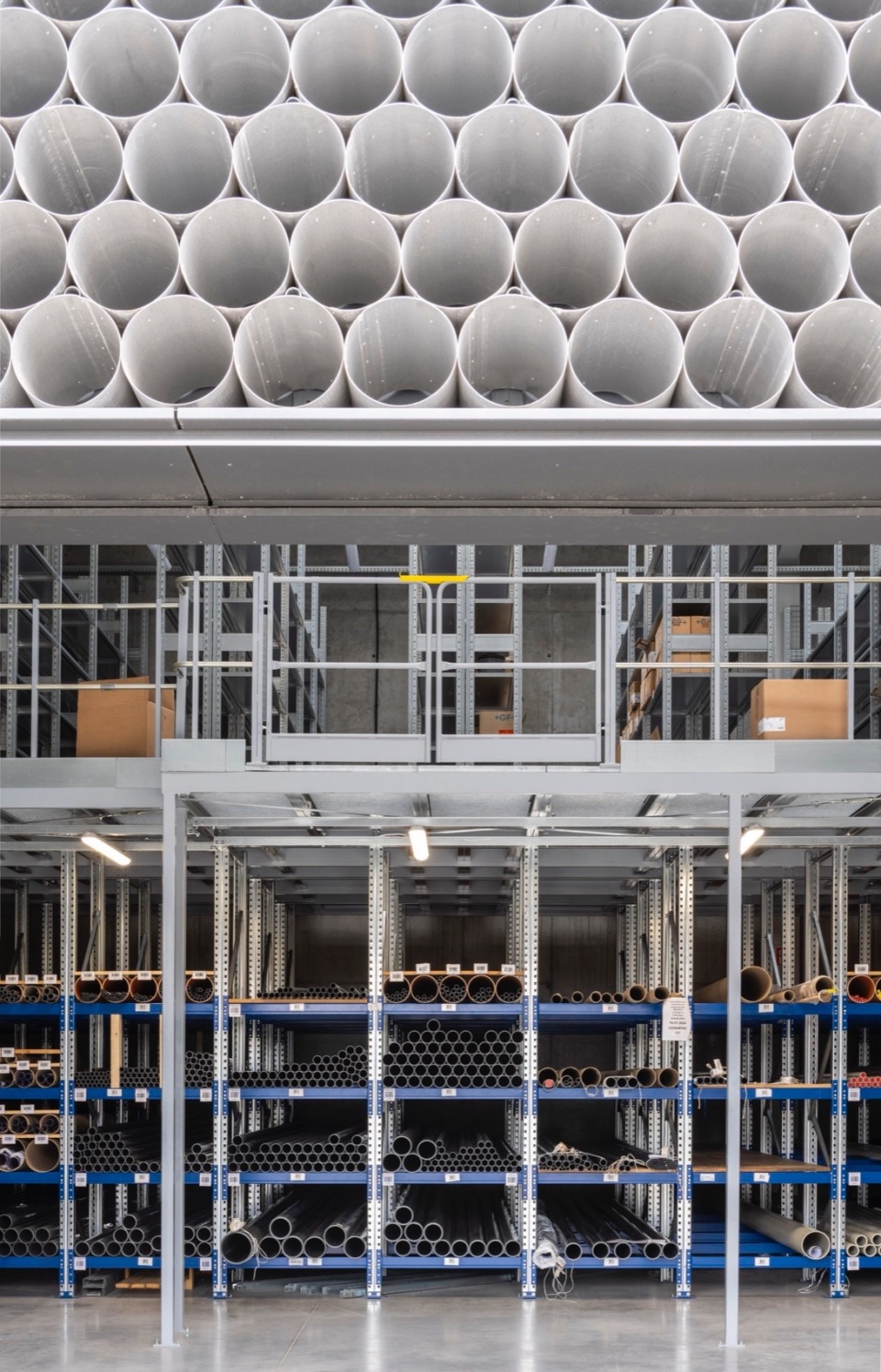 Gambit, a specialist pipe distribution company, commissioned us to design an office-warehouse building that would serve as its unique showcase. Yet we were asked to do it at the lowest possible cost. So we came up with the idea of using the material they trade in, which they could also acquire at cost. At the same time, we wanted the office and warehouse sections to form a unified whole. As a result, we designed the building to look like a stack of pipes, immediately communicating what the company does.