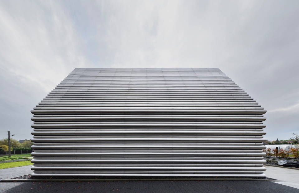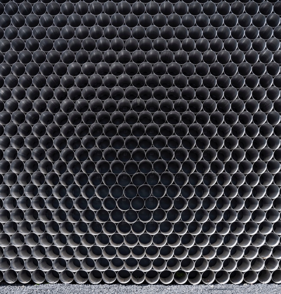 The way the pipes were laid out determined the pitch of the roof. The angled layout of the pipes creates the only possible inclination angle, which defines the shape of this part of the building.The office section with the sloping roof was trimmed at the second floor level to stay within the height limit set by the local zoning plan, and the additional volume would have been unnecessary. The office section with the sloping roof was trimmed at the second floor to comply with the local zoning height limit, and to avoid generating unnecessary volume. Interestingly, a few years later, Christo presented The London Mastaba, in which he achieved a similar form—this time resulting from the only possible arrangement of barrels.