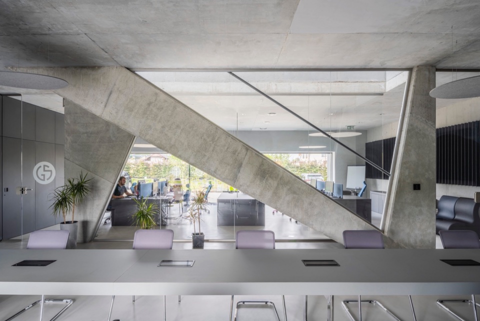 The interiors are well-lit by traditional windows and skylights. In the office spaces on the ground floor, designed for regular occupancy, employees have classic glazing with a view of a small garden carved out of the parking area. The storage area and auxiliary rooms on the upper floor, which require flexible space along the external walls, are illuminated by skylights. The building serves a strictly industrial function and is primarily surrounded by parking forcars and trucks. Therefore, on the roof of the lowest part, we have designed a relaxation terrace for the employees.