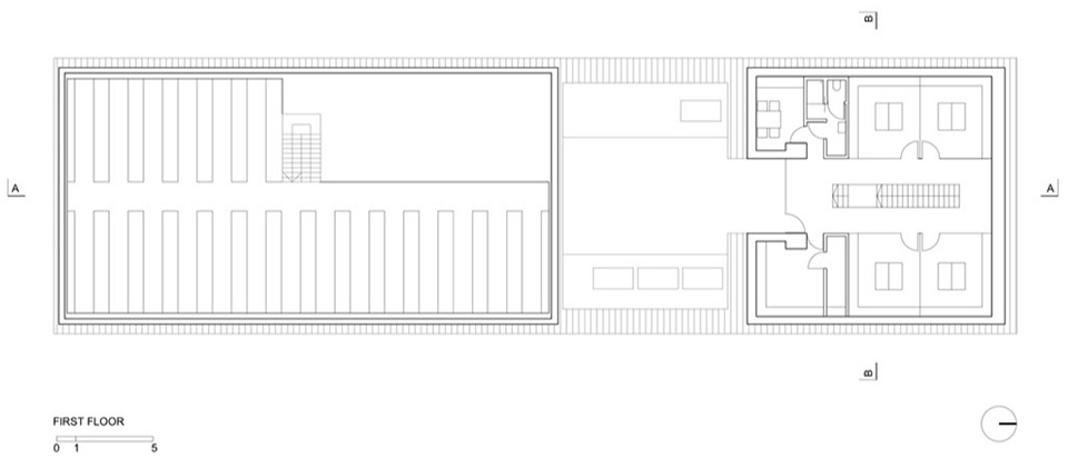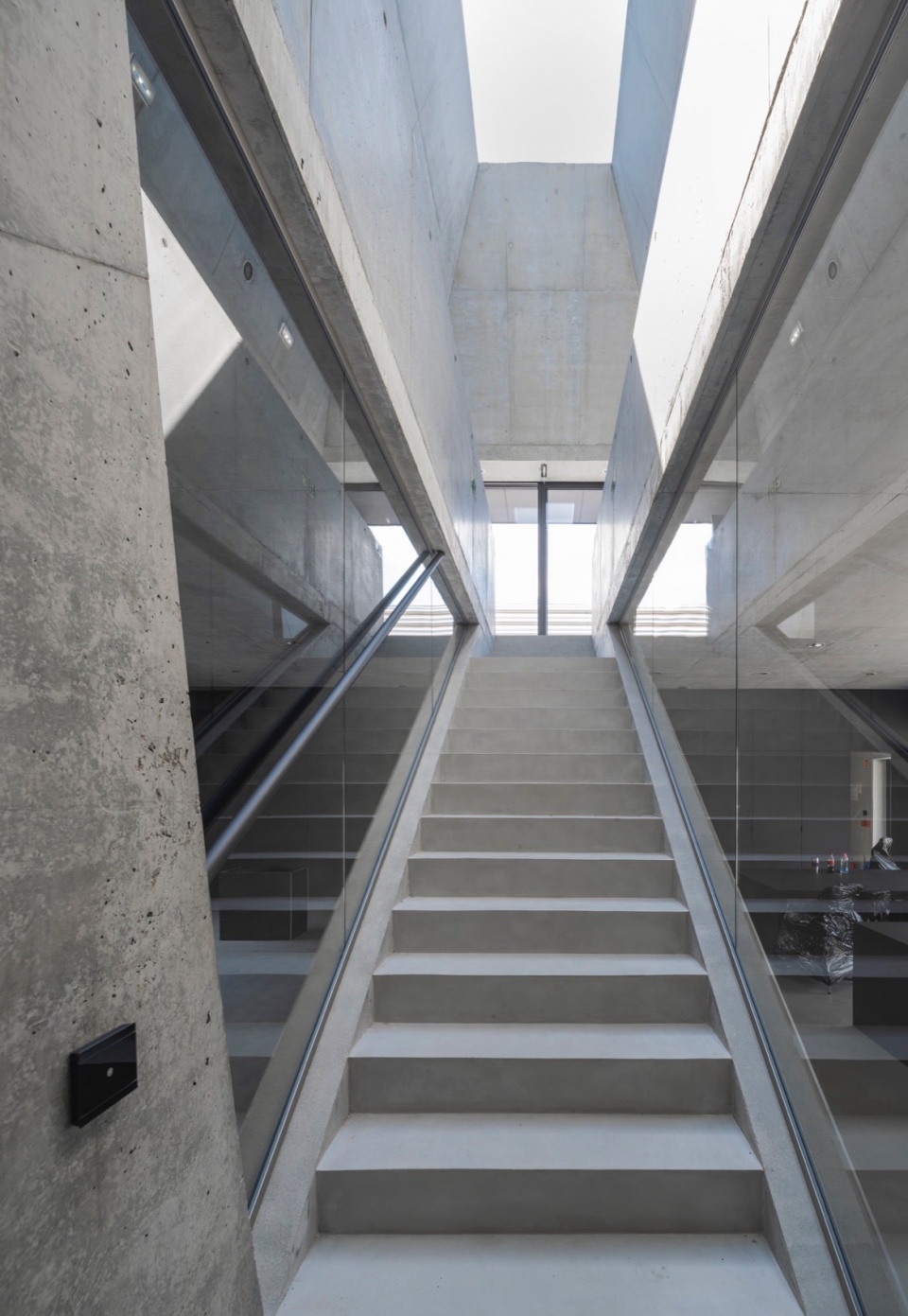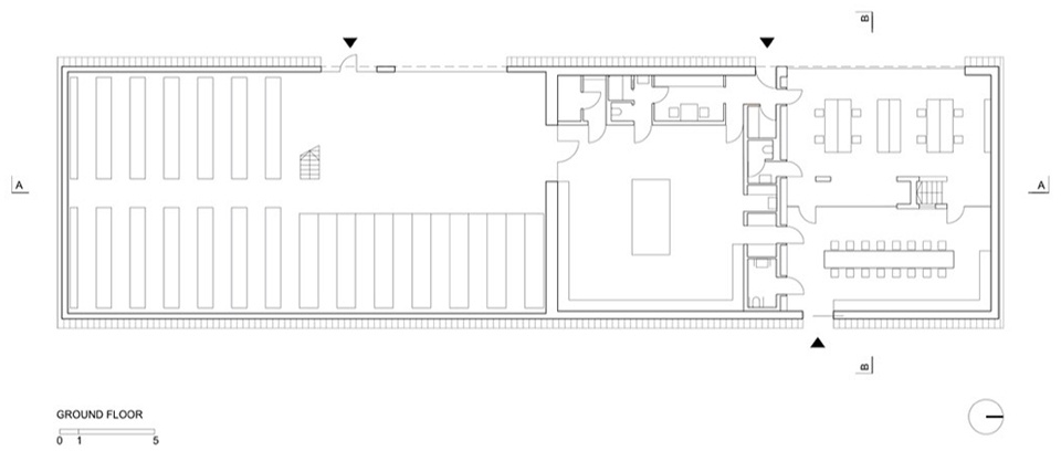 建筑内部的采光通过传统窗户与天窗共同实现。一层的办公区设有落地玻璃,可望向停车场中开辟出的花园庭院;楼上的储藏与辅助空间则通过天窗获得自然光线,确保空间灵活可变。由于建筑以工业用途为主,周边主要为卡车与汽车的停车场。因此,建筑师在最低体量的屋顶上设置了一个员工休憩露台,为这座功能导向的工业建筑注入一份温暖的人文关怀。