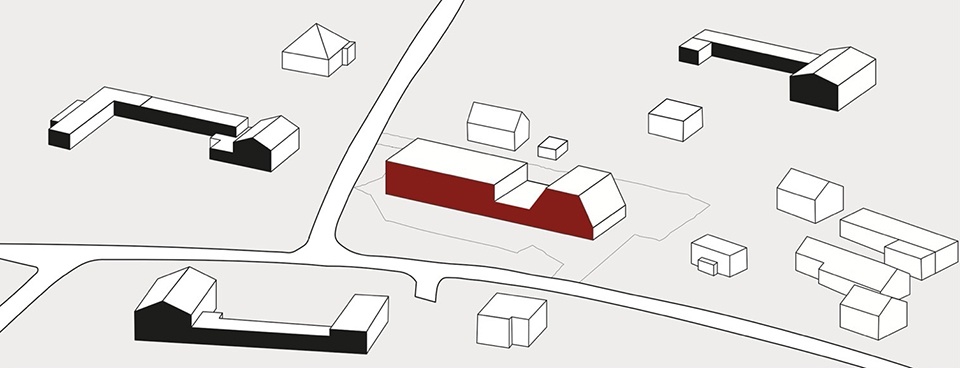 项目场地原为一座矩形厂房,周边则以坡屋顶住宅为主,常配有修长的立方体附属建筑。这种地域特征启发了建筑的最终体量构成。建筑的三大功能——仓库、订单准备车间和办公区,分别通过体量的高低与形状加以区分。办公区位于一座带有斜面墙体的两层结构中;中部较低的部分设为车间;最高的立方体则为无采暖的仓库。