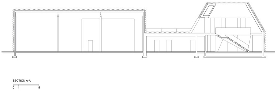 屋顶的坡度由管道的排布方式自然决定。斜向布置的管道限定了唯一可能的倾角,也由此生成了办公区屋顶的形态。为满足当地城市规划对高度的限制,建筑师在二层处削平了办公体量,避免不必要的空间浪费。有趣的是,几年后艺术家克里斯托(Christo)在《伦敦马斯塔巴》中,也通过对桶的唯一排列方式,形成了相似的几何形体。