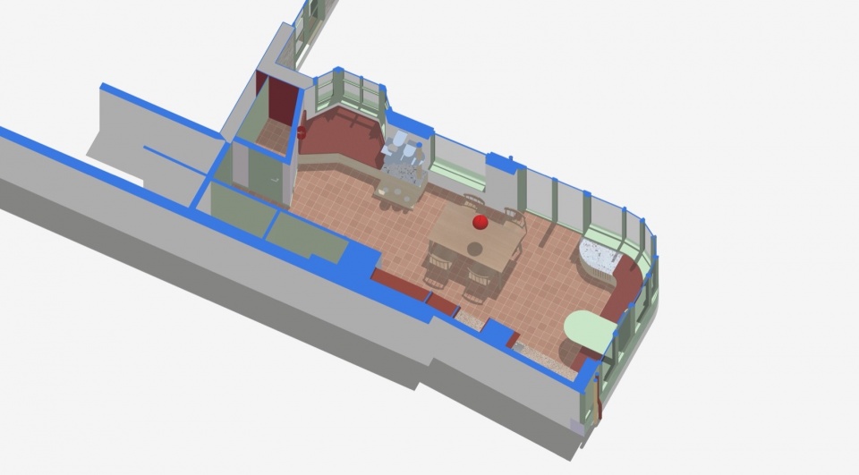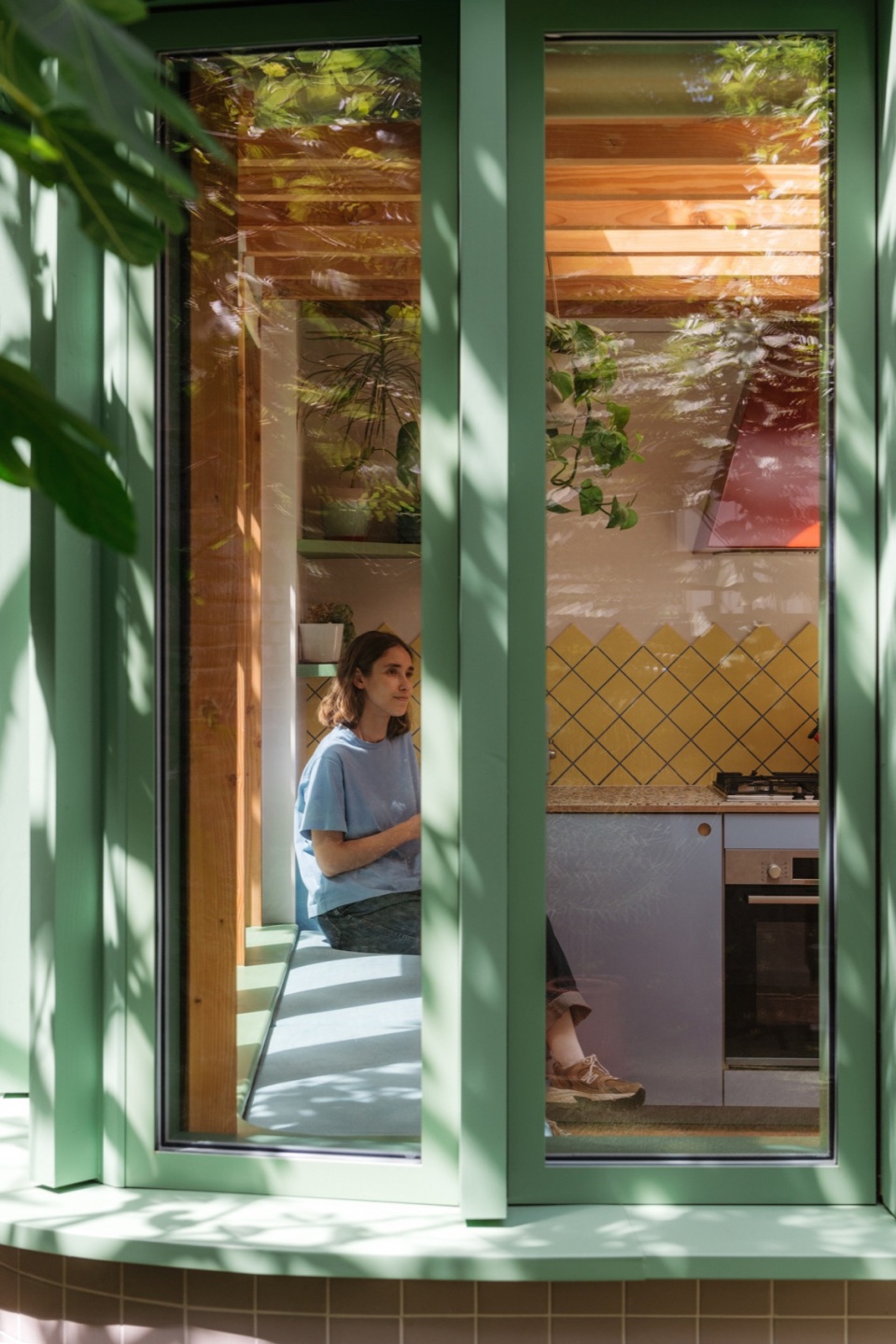 窗户的位置经过精心布置,框景出优美的自然画面,加强了住宅与环境的联系。扩建体的圆角和大面积玻璃窗正对那堵历史墙,柔软的座椅让主人和猫咪能惬意地观赏窗外绿意和生动景象。厨房上方的大型圆形天窗将树冠的景色纳入室内,在下方餐厅投射出斑驳光影。