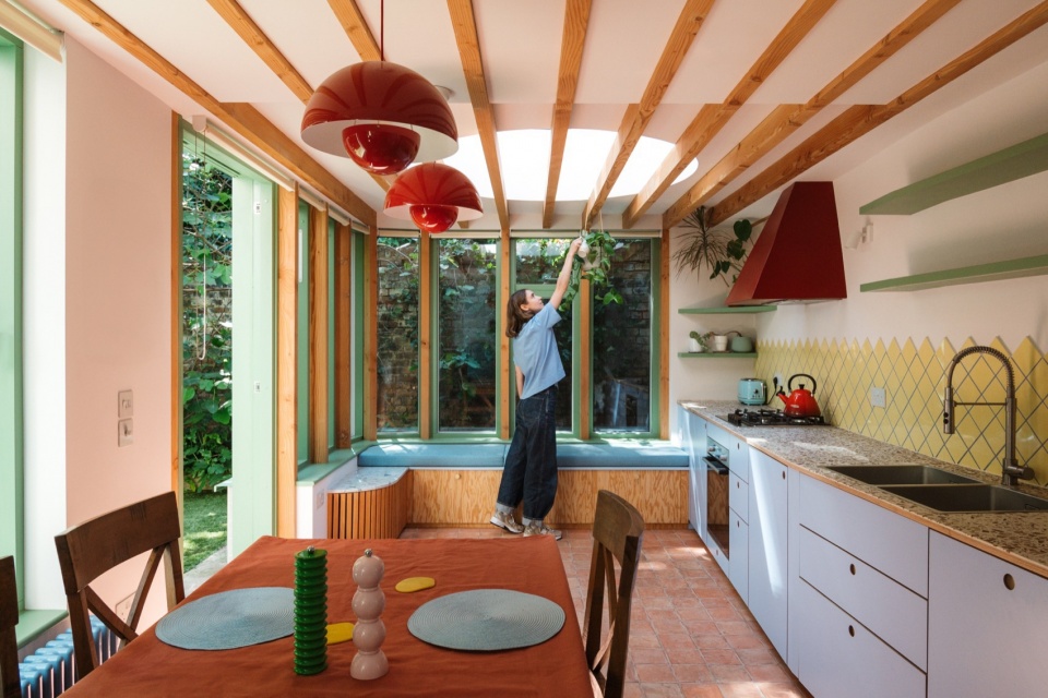 The project replaces a leaky polycarbonate conservatory with a thoughtfully designed extension that accommodates a generous dining and living space, reading and writing nooks, and playful features for the cats. The new ground floor also includes a WC and utility storage space, all hidden behind a continuous folding wall.