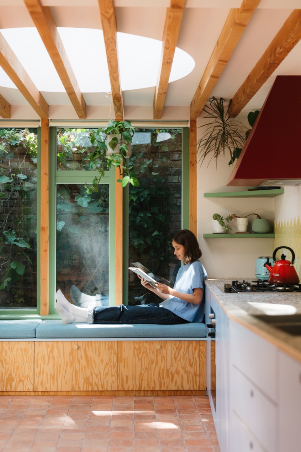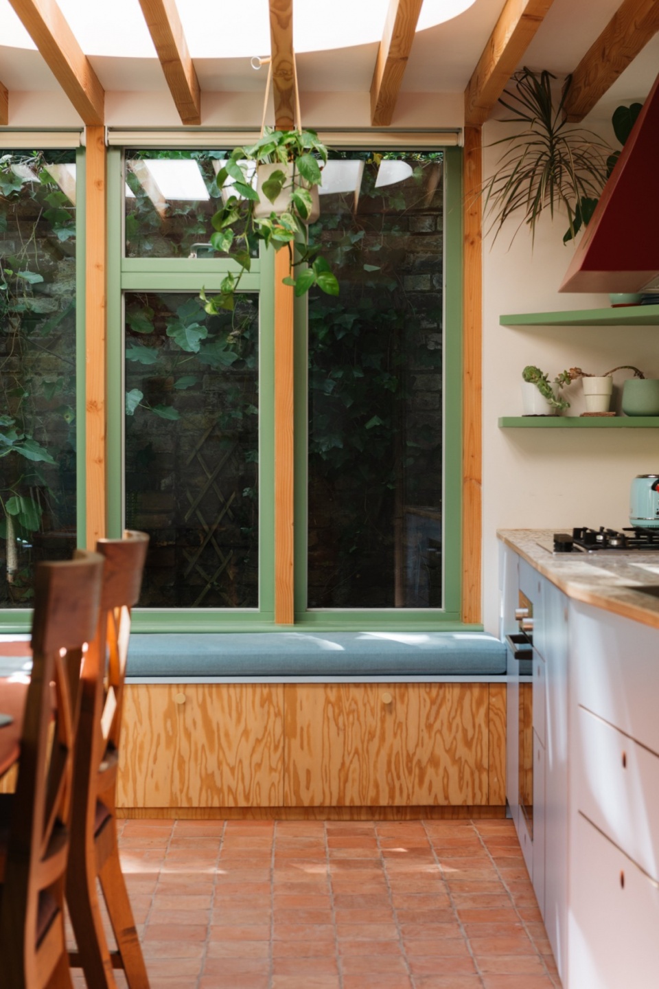 Carefully positioned windows frame picturesque views, enhancing the home’s connection with its surroundings. The curved corner of the extension and large glazed windows frame the historic wall, where soft seating allows the homeowners and their cats to observe the greenery and lively scenes unfolding outside. A generous circular rooflight above the kitchen, frames views of the tree canopy, allowing the homeowners to bask in the gentle play of shadows in the dining area below.