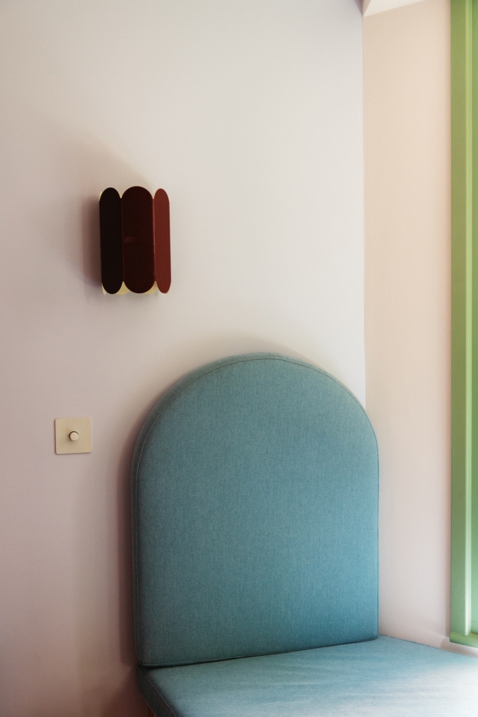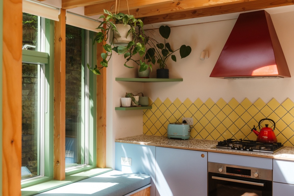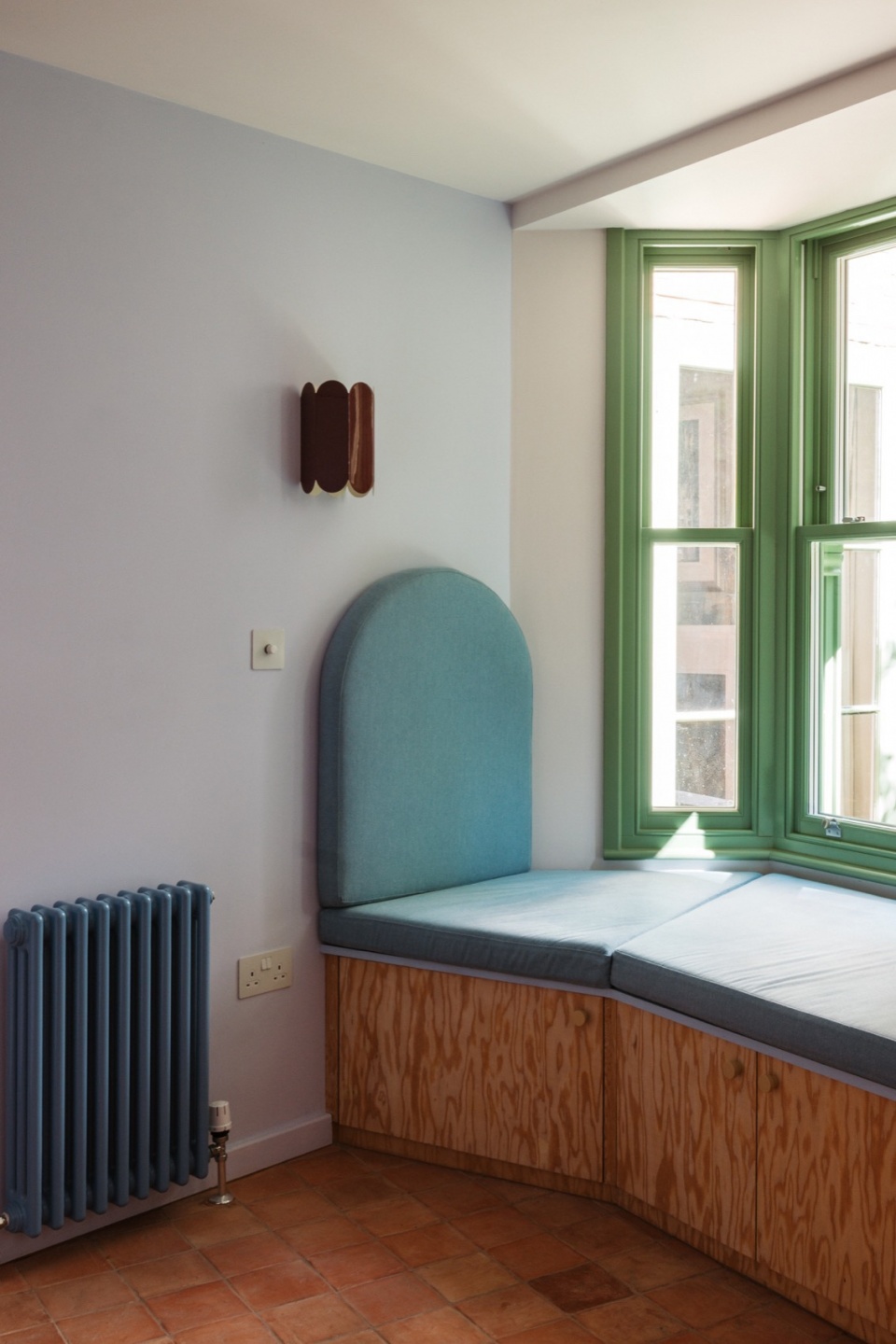 Every aspect of the space has been designed to cater to both its human and feline occupants. A landscape of soft seating, designed to wrap around the dining and kitchen areas offer a variety of cosy reading nooks, cosy hideaways for the cats and seating. An upholstered bay window, paired with a wall light and a fold-out table, provide the perfect spot for reading with a cup of tea. A bespoke cat climbing frame combines playful elements with practical warmth, featuring a heated bed and ample spaces for climbing, lounging, and play.