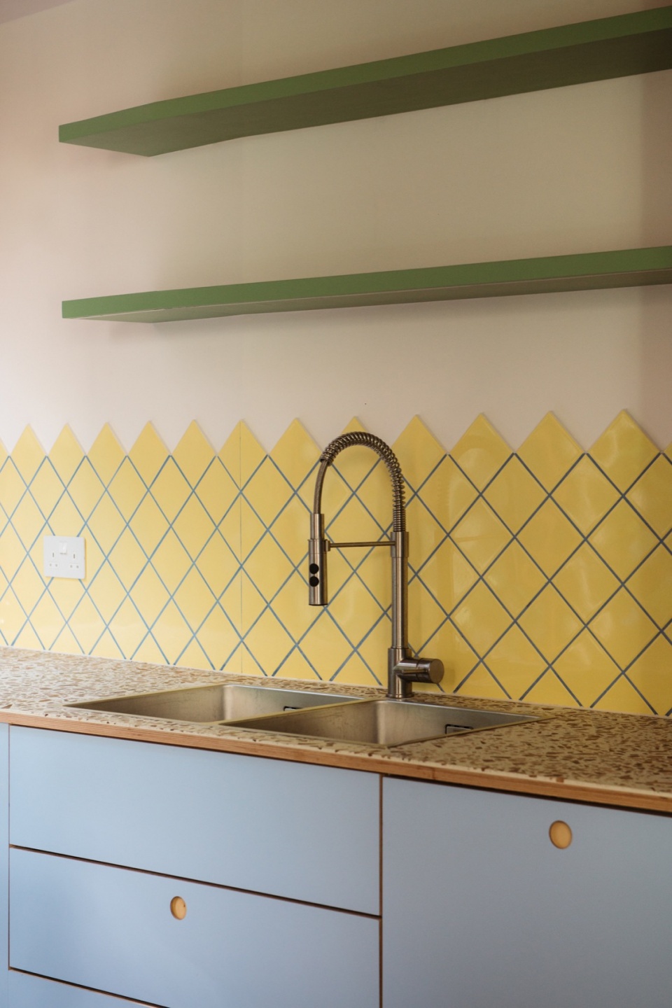 The design features a palette of natural materials and colours, inspired by and drawn from the surrounding woodland. Timber is a unifying element throughout the project, used for the structure, joinery, windows, and furniture. Handcrafted worktops are made from recycled wood-chip waste set into terrazzo, adding a unique touch of craftsmanship and warmth to the space. Raw terracotta tiles echo the earth of the forest floor, and the external finishes use a colour palette that is inspired by the changing seasons, with earthy green and burgundy tones, complemented by a lilac-tiled plinth that wraps around and unites the extension with the existing house.