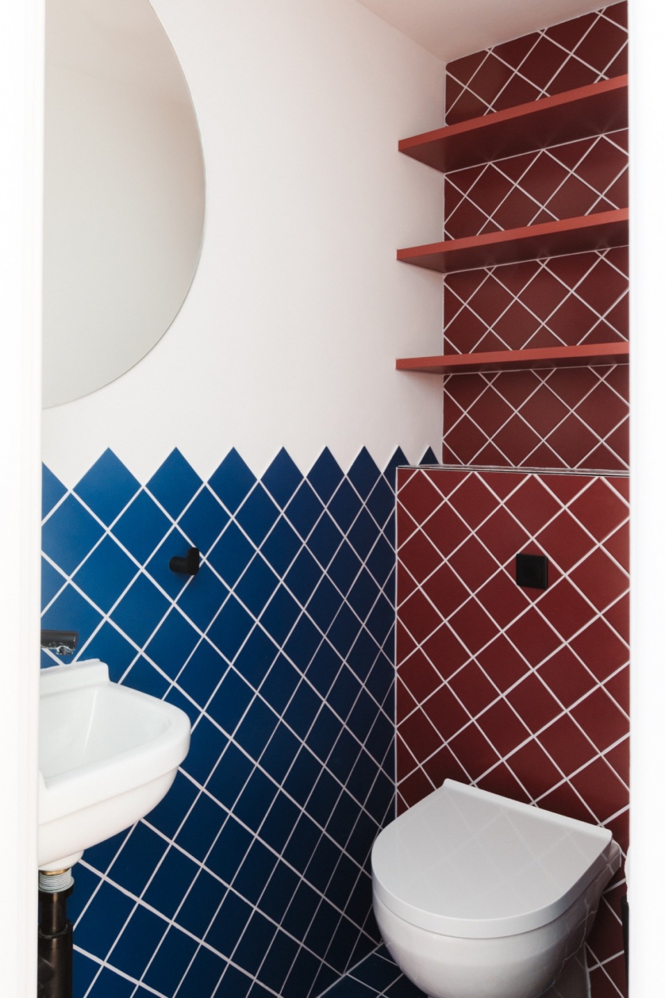 earthy green and burgundy tones, complemented by a lilac-tiled plinth