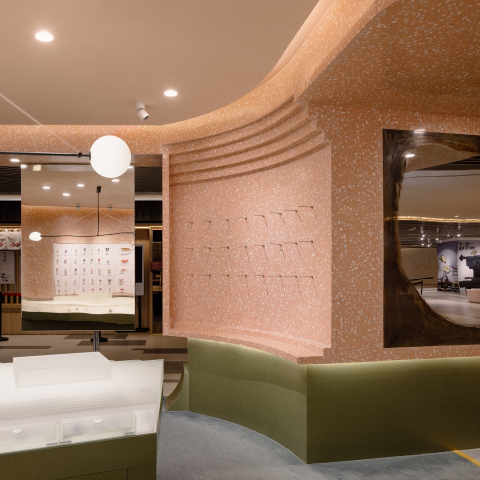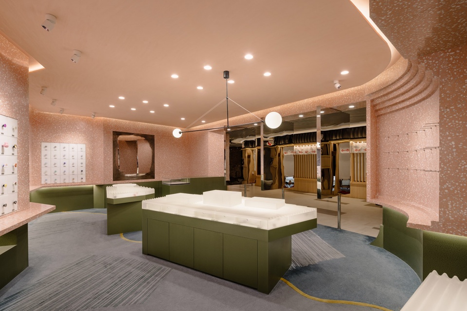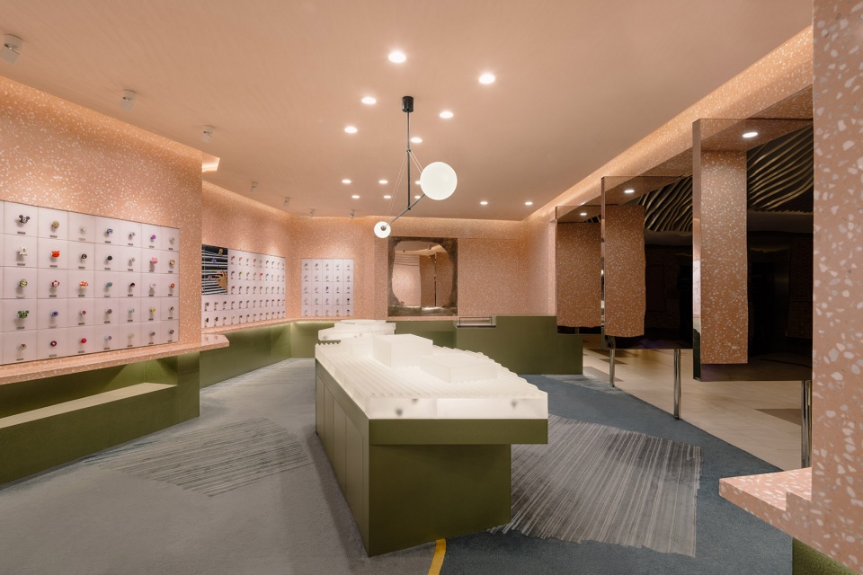 在设计手法上,Yatofu借鉴考古发掘的层次感与解构性,将空间逐层掏空,挖掘出负形,从而定义功能分区。这种如同岩石开采般的空间塑造方式,使人们在不同角度和路径中,都能感受到丰富而立体的空间体验。主材选用了粉色水磨石,其柔美质感与PopSockets的品牌个性相呼应,也为空间注入一抹独特且鲜明的视觉语言。产品展示区域以下,设计团队采用藻绿色金属材质,打造出犹如矿石挖掘场中散落的巨型石块,这些形态各异的展示装置,不仅承载展示与储物功能,更与水磨石材质形成强烈对比,营造出层次丰富且充满张力的视觉景观。