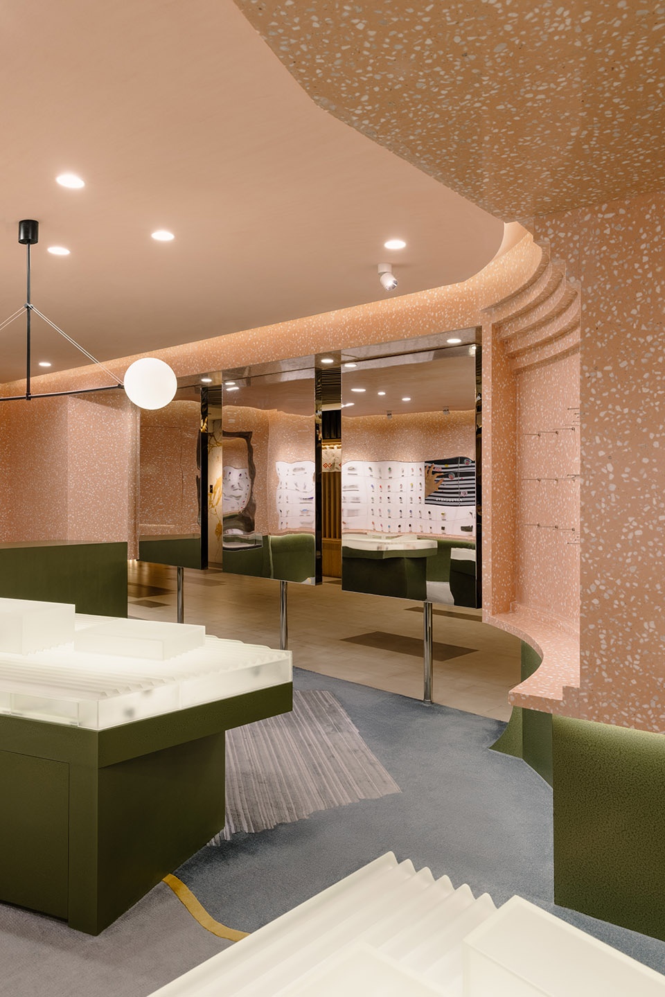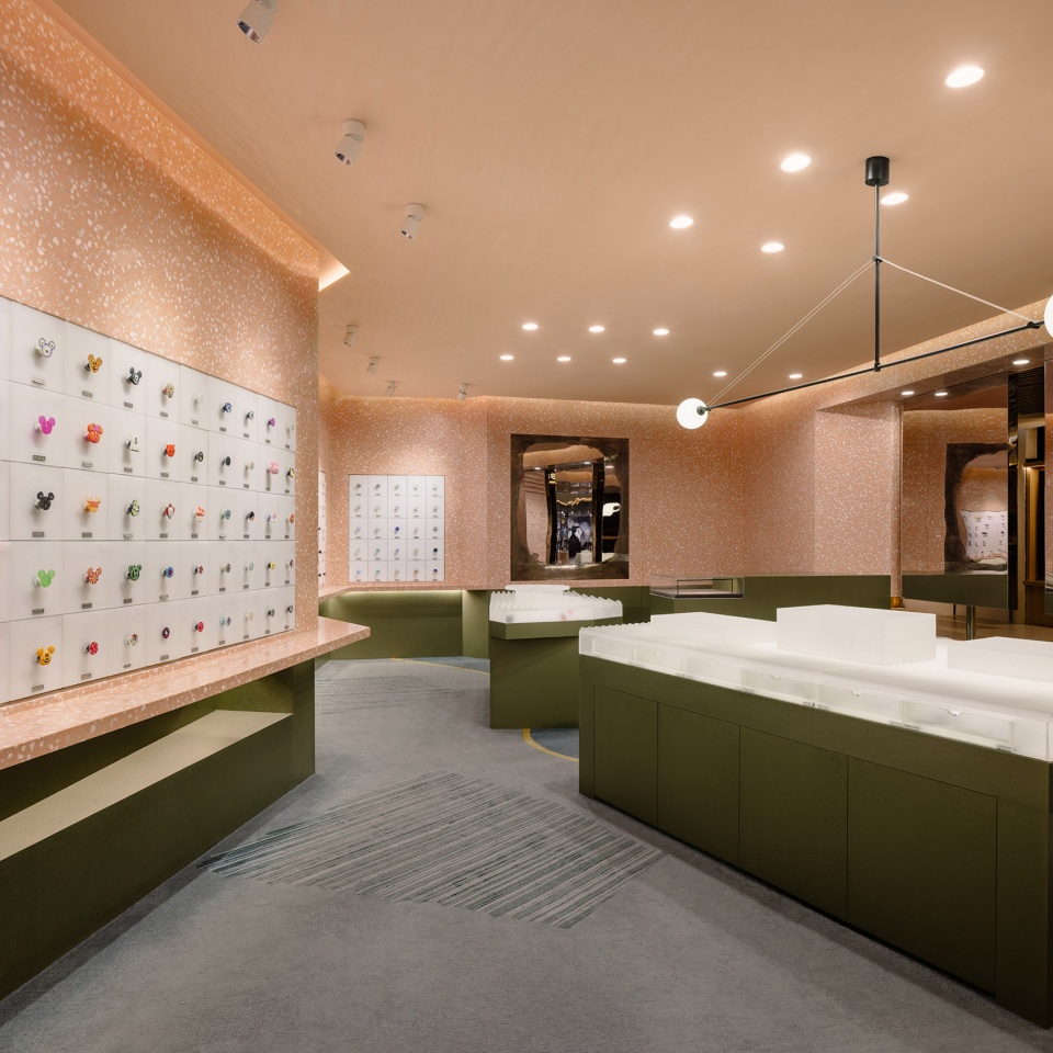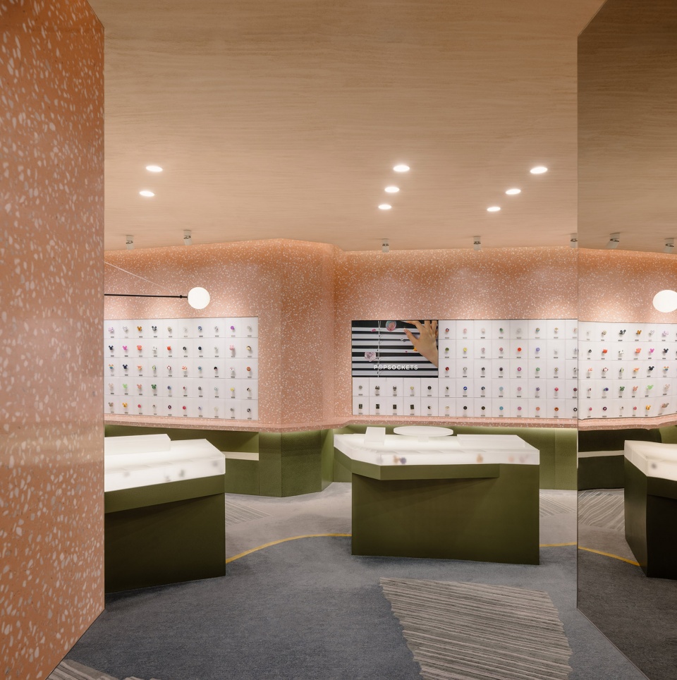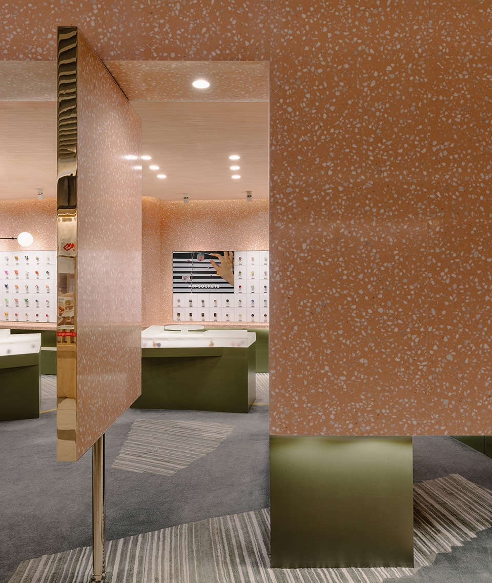 Inspired by the stratified process of excavation, the design adopts a subtractive approach—carving out negative forms layer by layer to define functional zones. This method of shaping the space, reminiscent of rock quarrying, creates a dynamic and multidimensional experience from different angles and perspectives. The primary material of pink terrazzo was chosen for its smooth, polished quality and warm visual softness, echoing the playfulness and vibrancy of the PopSockets brand while establishing a distinct and memorable visual identity. Below the product display line, algae green metal elements take the form of scattered, monolithic “stones,” reminiscent of an excavation site’s unearthed boulders. These striking forms serve both display and storage functions, offering a rich contrast to the terrazzo and adding visual tension and depth to the space.