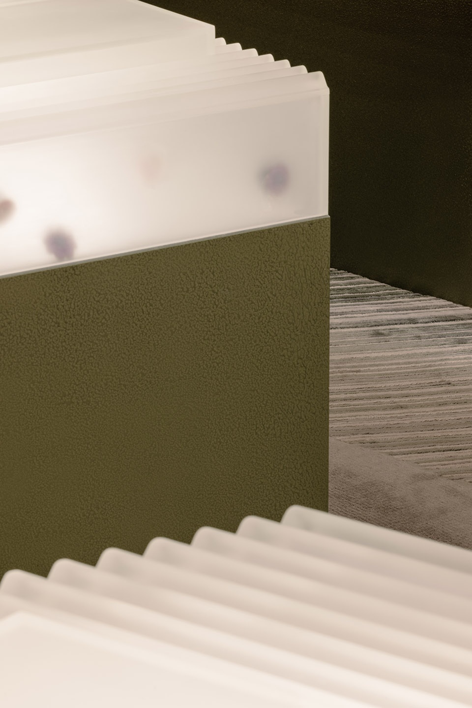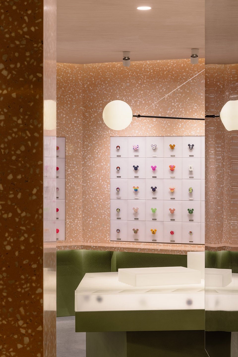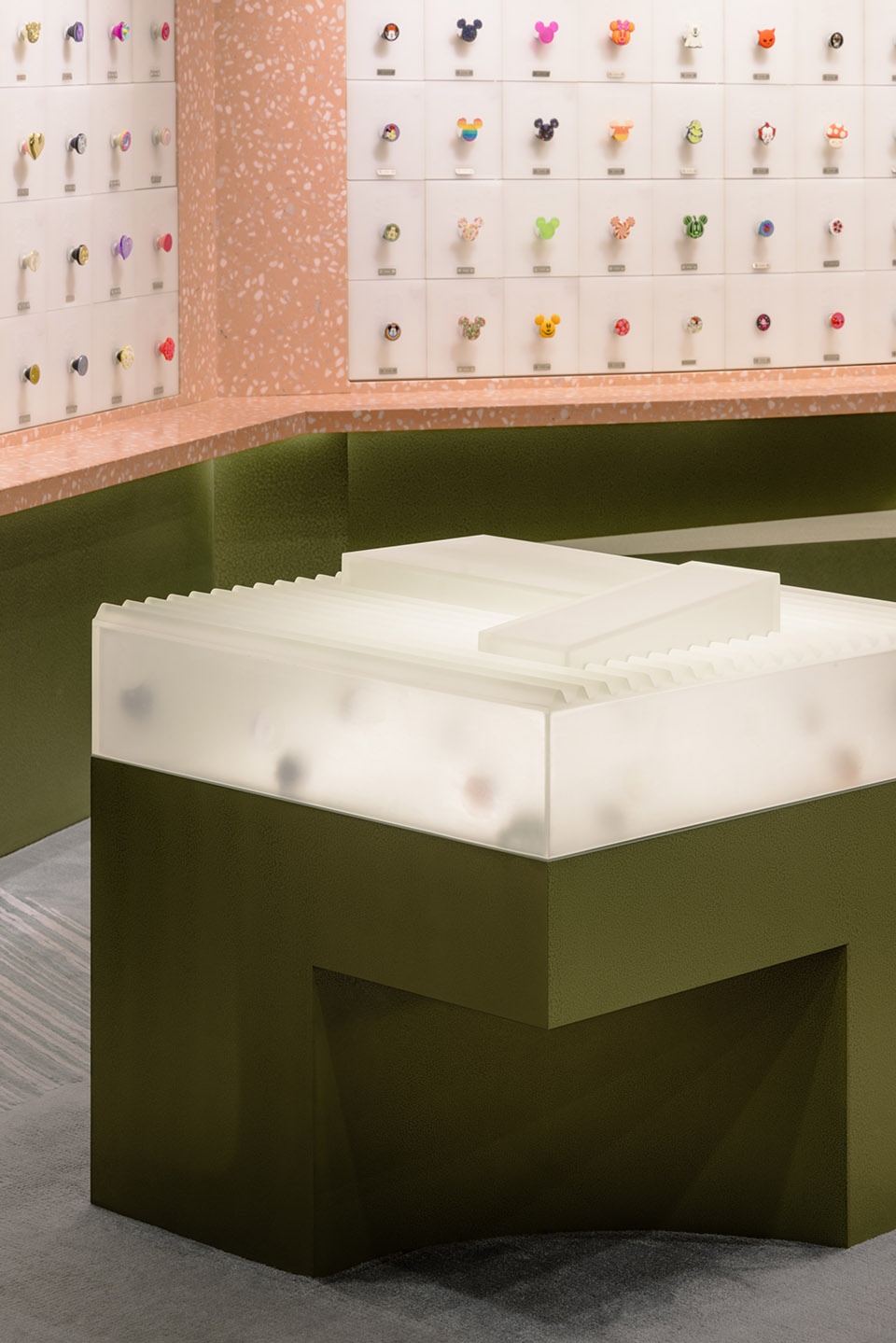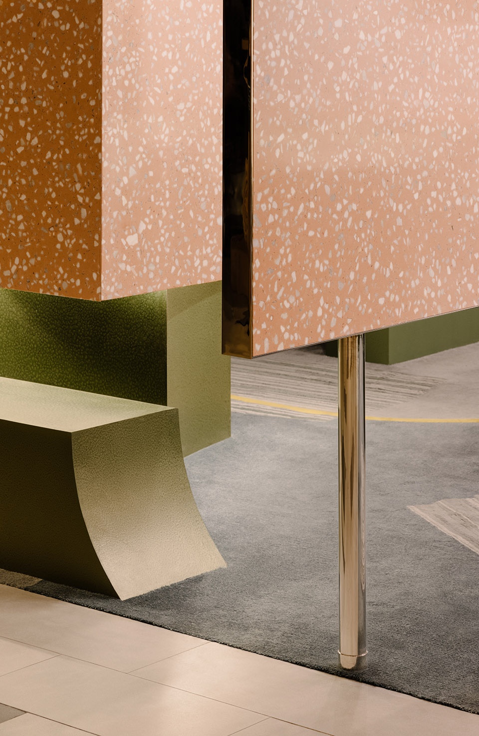 Inspired by the stratified process of excavation, the design adopts a subtractive approach—carving out negative forms layer by layer to define functional zones. This method of shaping the space, reminiscent of rock quarrying, creates a dynamic and multidimensional experience from different angles and perspectives. The primary material of pink terrazzo was chosen for its smooth, polished quality and warm visual softness, echoing the playfulness and vibrancy of the PopSockets brand while establishing a distinct and memorable visual identity. Below the product display line, algae green metal elements take the form of scattered, monolithic “stones,” reminiscent of an excavation site’s unearthed boulders. These striking forms serve both display and storage functions, offering a rich contrast to the terrazzo and adding visual tension and depth to the space.