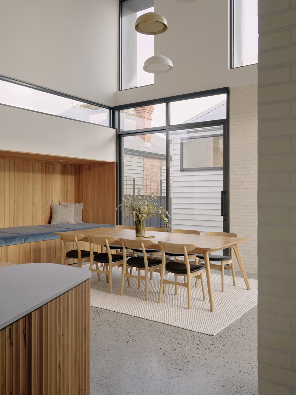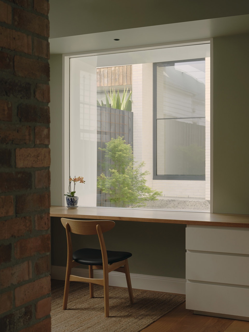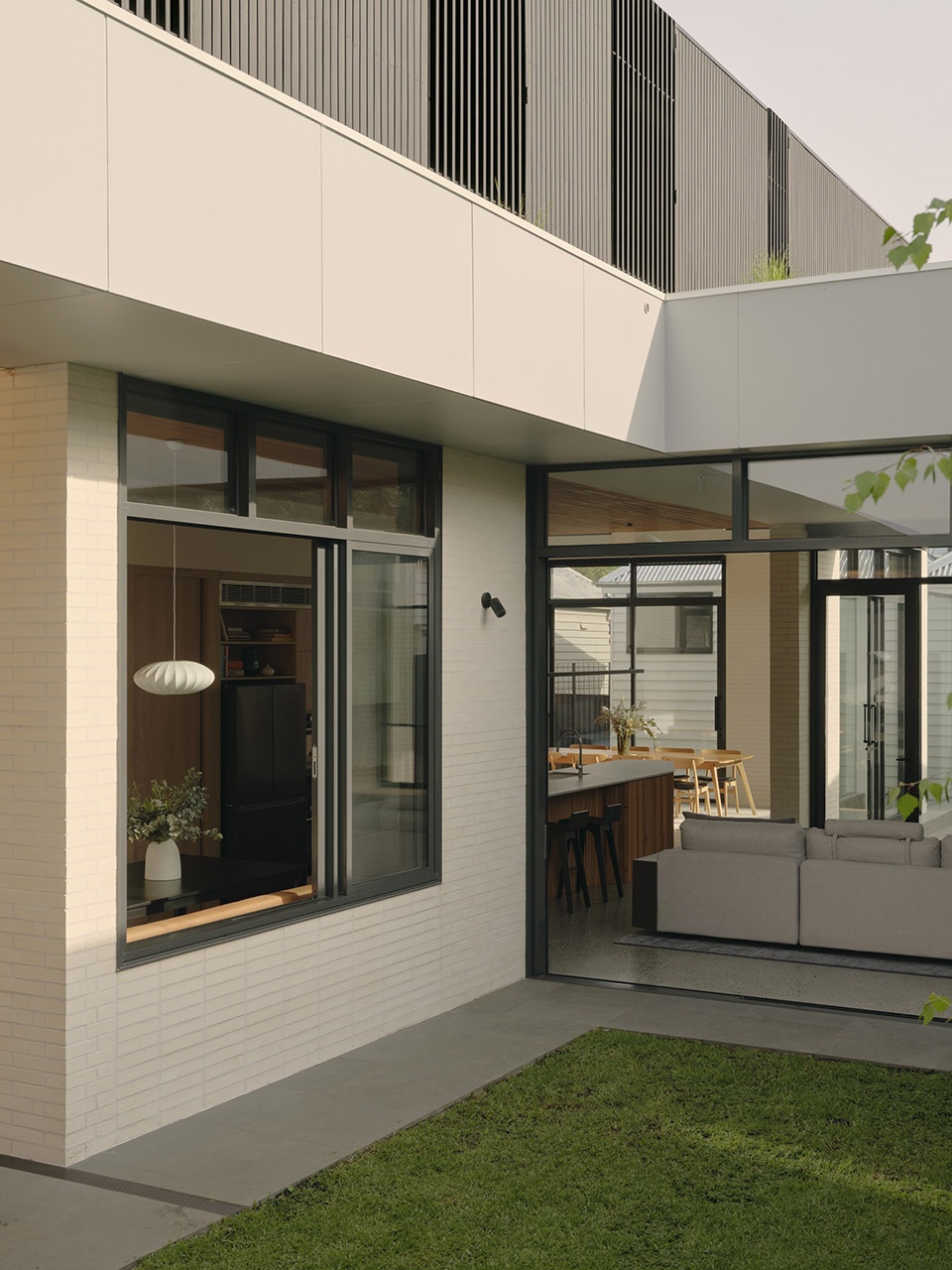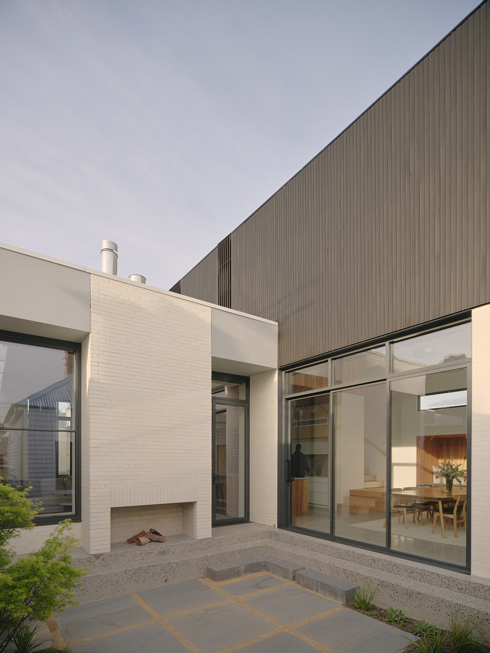 A restrained, low maintenance material palette of brick, concrete and charcoal timber was used to contrast the existing weatherboard cottage.