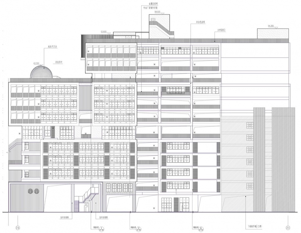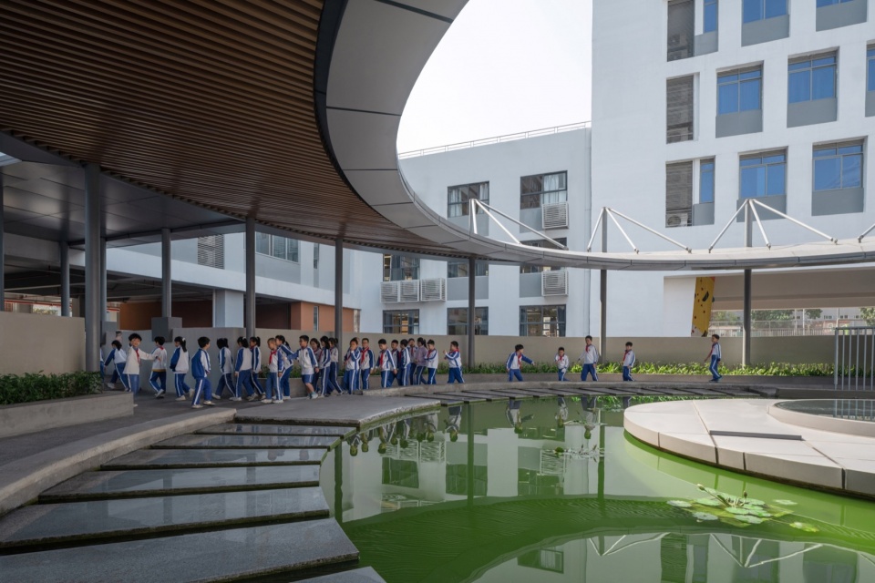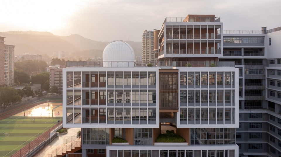 Given the acute shortage of educational resources in the area, the expansion strategically preserved three key structures: the seven-story Sino-English Experimental Building, the five-story primary school classroom building adjacent to the playground, and the cafeteria-dormitory complex to maintain uninterrupted operations. Situated in Buji Urban Village with limited land and high density, the project tripled the built-up area within tight spatial constraints while ensuring seamless integration between old and new campus sections – a formidable design challenge.