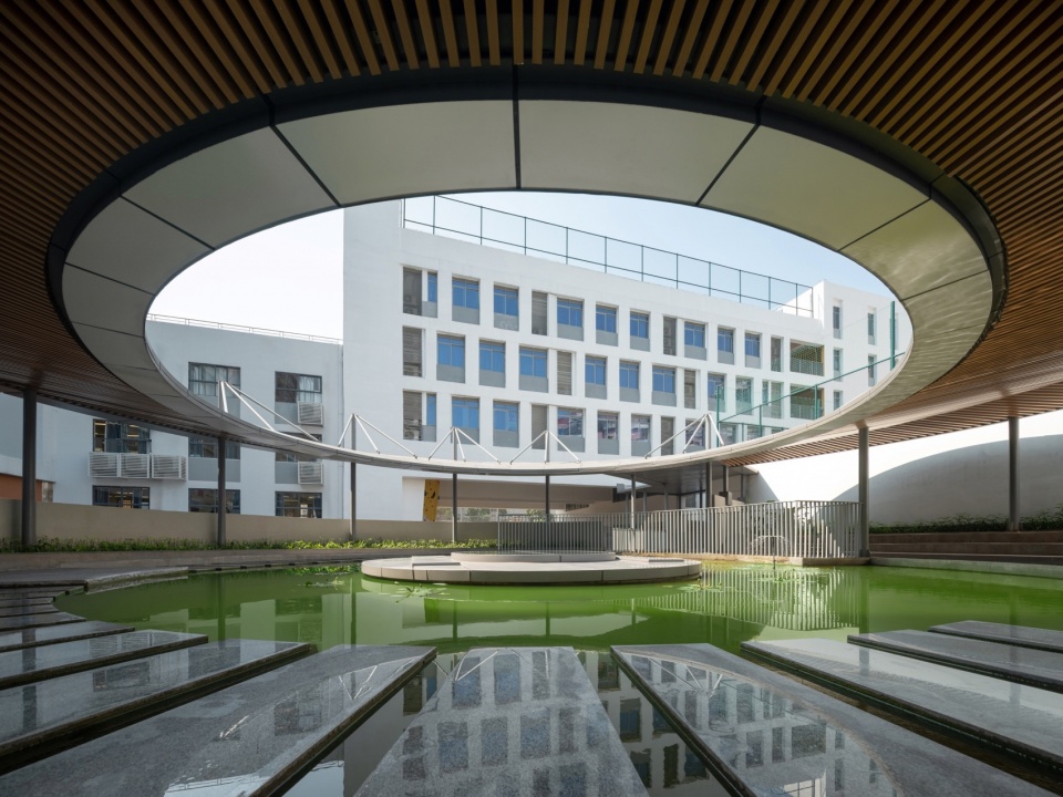 At the heart of campus, the “Longling Eye Art Gallery” bridges old and new dining halls. This annular structure doubles as a second-level landscaped bridge with water features and an internal gallery. The central “Path to Wisdom” weaves through courtyards, gardens, and activity zones from the playground outward, creating an adventurous learning journey.