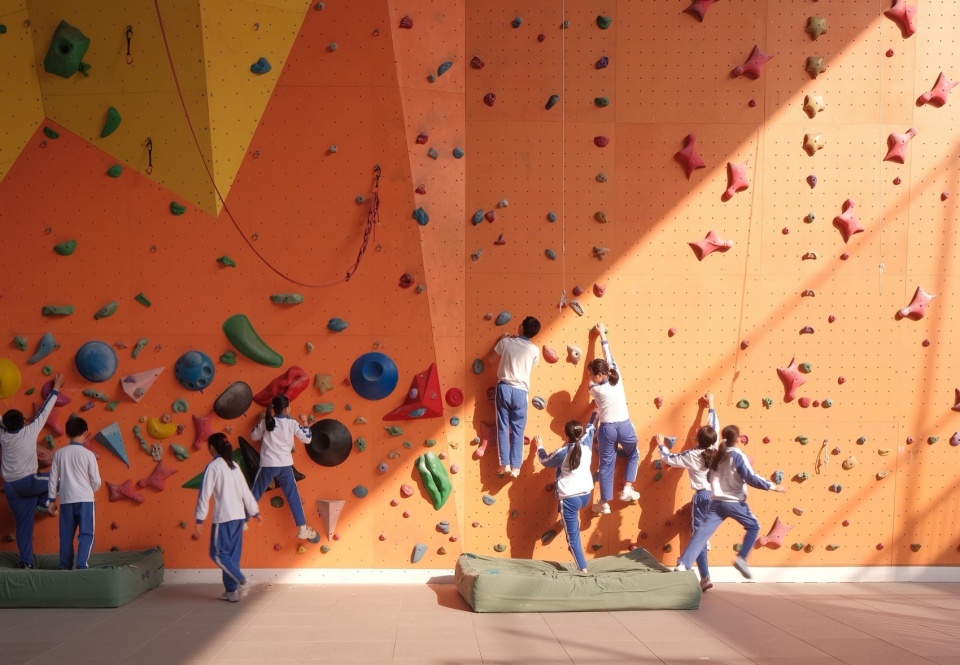 教育的变革与承载功能的校园建筑彼此影响密不可分。过去,学校是集中式的单一线性教学空间。而现在,教育是多元化的,被动吸收知识的模式逐渐被摒弃,激发兴趣,引导学生去主动学习,培养他们的自我意识和特长,才是未来教育的趋势。因此在改造中设计师创造了一座充满趣味的“知识山丘”,和一条寓意着“书山有路”的登山道让学生们自发探索未来的道路。结合校园处在的独特地理位置,改造升级的不仅是一所学校,而在建造一座校园式的"村中城"。