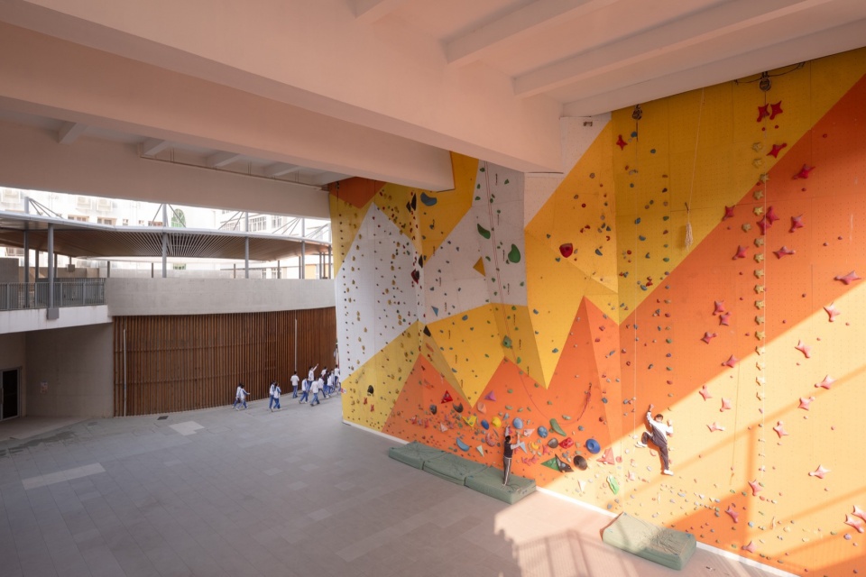 为了让校园与城市连接,一座与社区融合的校内双层文化艺术体育中心被放置在与社区的交界处。整个双层跑道运用V型结构柱支撑,橙红色的地面和与灰白色的混凝土柱子形成了鲜明的对比,既美观又具有活力。在保证安全的情况下当地居民可以与学生错峰共享使用。