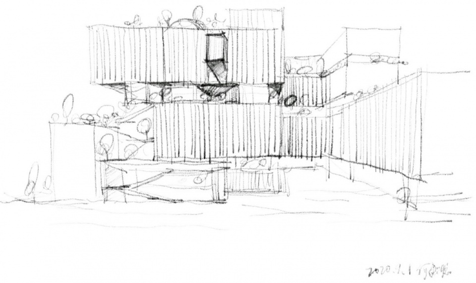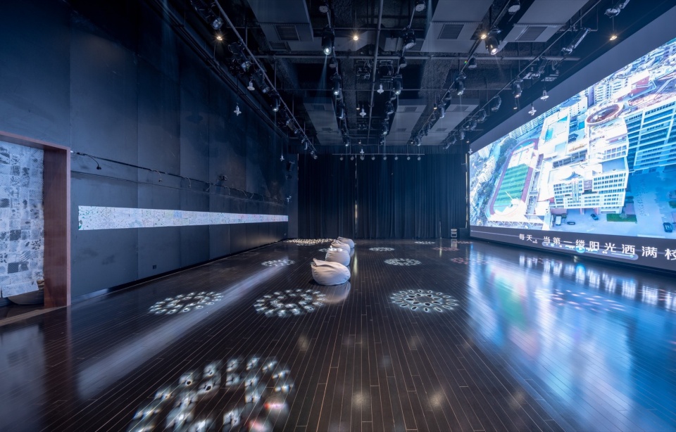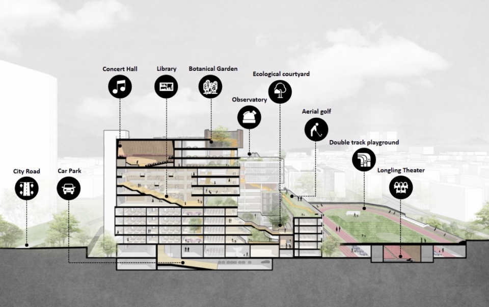 象征着龙岭精神的“龙岭之眼美术馆”被放置在新旧食堂之间。它整体是一个独立在教学楼之间的环形建筑,二层作为校园连廊景观水池使用,内部是一个校园美术馆。一条整合交通、导向、游憩等功能“登山道”从靠近操场展开,将散落在校园的各个有趣的中庭、花园、户外活动空间高效的串联在一起,就像一场奇妙的校园冒险即将启程。由于地处城中村城市密度大,周边缺乏运动、阅读等公共服务配套。
