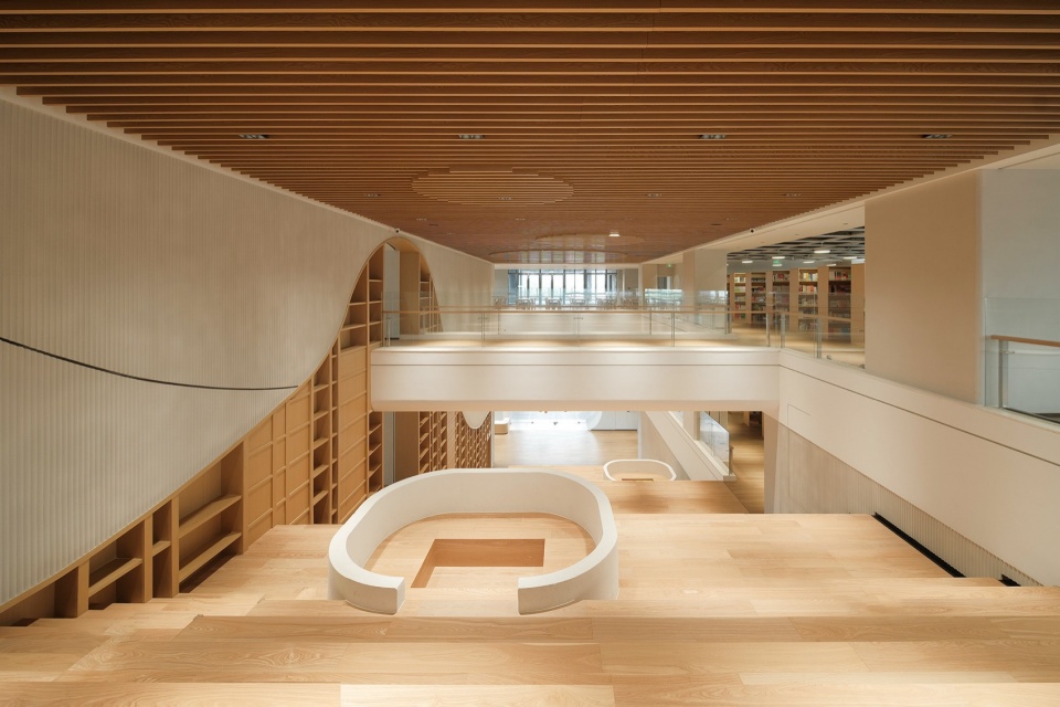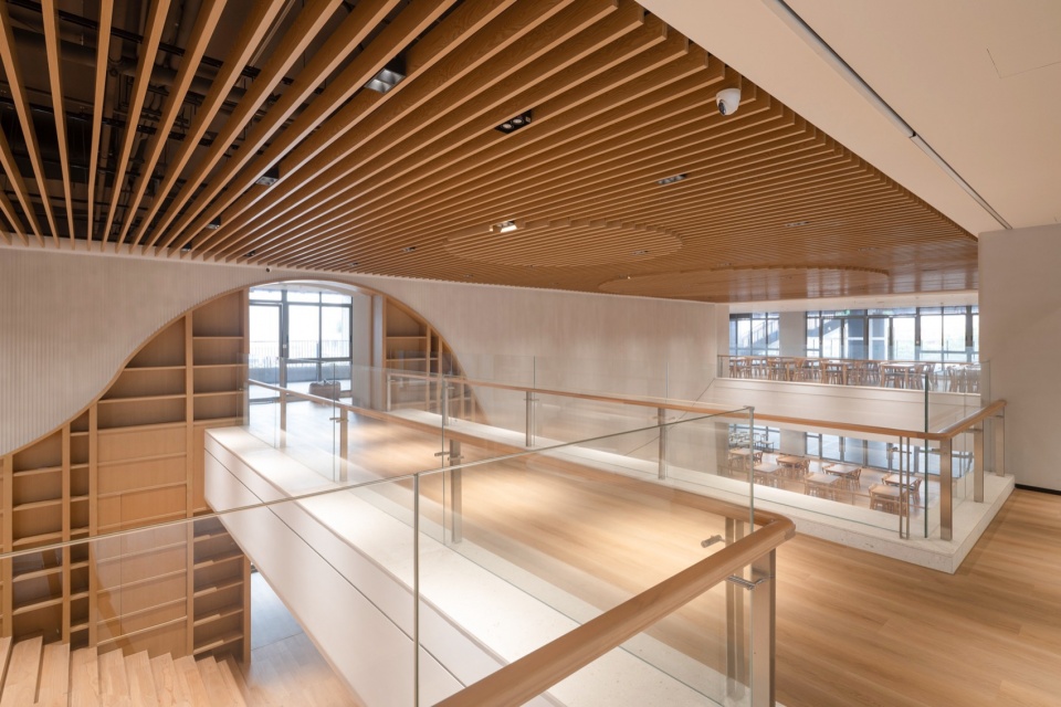The vertical library spans floors 6-12 of the main building with dedicated access on each level, its four-story white wave-like walls evoking an ocean of knowledge. Diverse spaces like the Minong Theater, black box studio, golf simulator, shooting range, and ceramics workshop cater to varied interests.