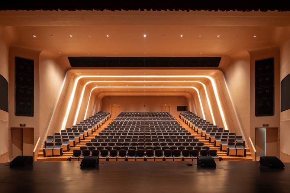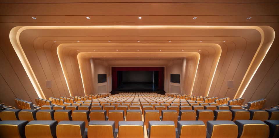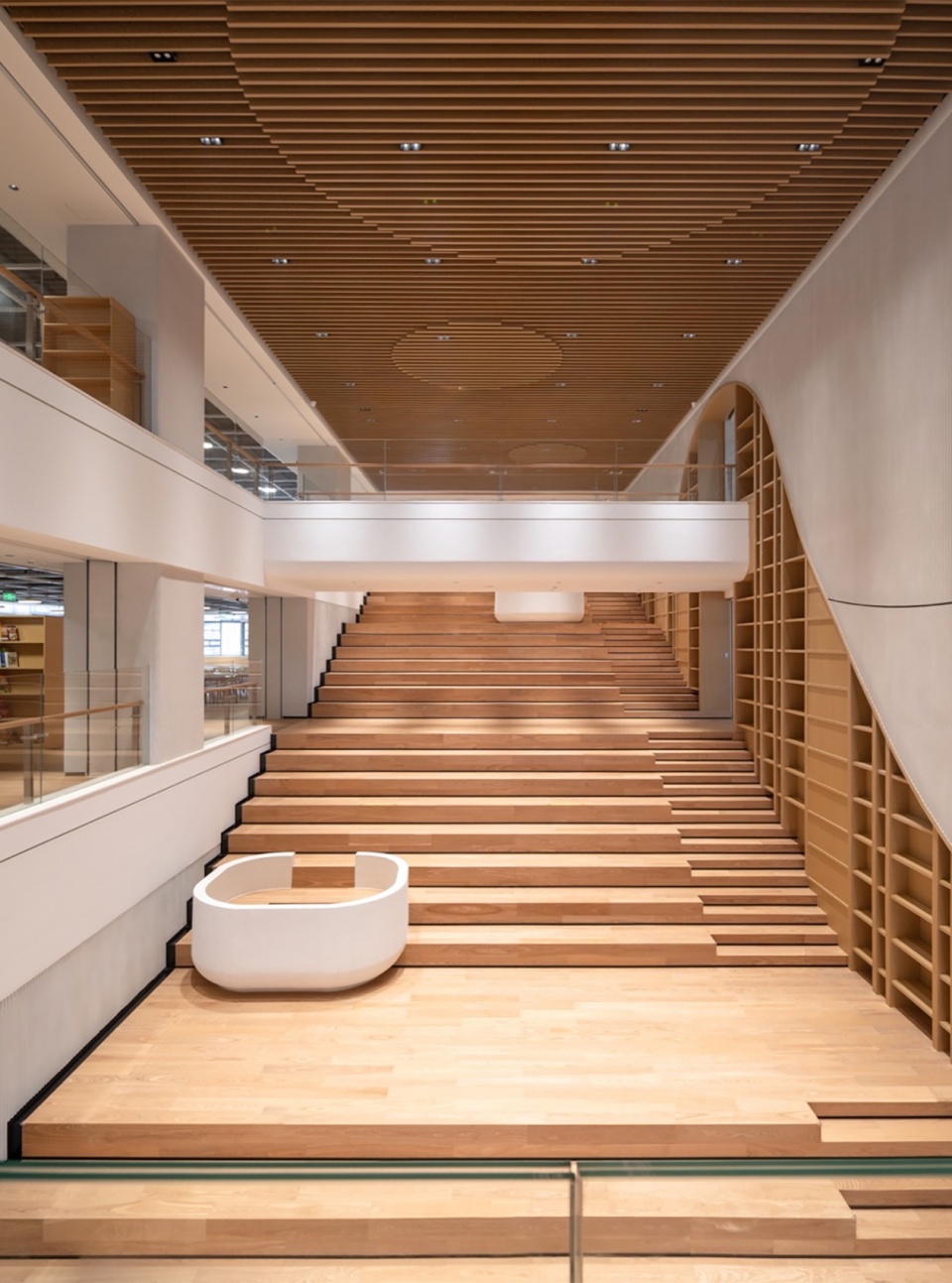 四层通高的立体图书馆,位于主教学楼的六至十二楼,每层都有相应的入口,可以让学生在课间进入。这里集合了阅读、娱乐、社交、学习的公共空间。图书馆四层通高的墙壁运用了白色的波浪元素,仿佛进入了书籍的海洋。敏聪剧场、黑匣子、多功能教室、高尔夫球馆、射击室、音乐厅、羽毛球馆、陶艺教室等空间应接不暇,可以满足任何兴趣需要。