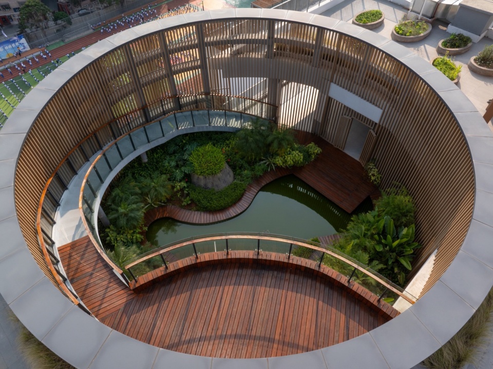 Addressing the neighborhood’s lack of public amenities, a double-decker cultural-sports complex was placed at the community interface. Its orange-red track suspended by V-shaped concrete columns creates striking visual dynamism. This facility operates on staggered schedules for students and residents.