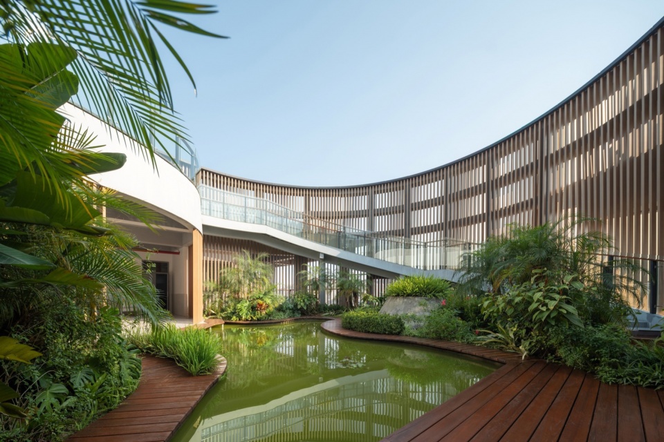 The rooftop features circular ecological gardens connecting to urban farms, nurturing children’s curiosity through hands-on agricultural learning. Every space becomes a classroom without boundaries.