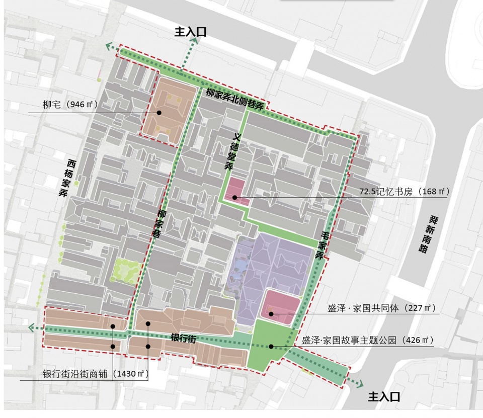 银行街名人故居云集,承载了盛泽各阶段历史的缩影,片区素有 72.5 巷弄的传名,巷弄多,且有些为单向尽端道路。虽不符合现代城市发展的要求,但是具有历史古城的特色和记忆。建筑整体分为粉墙黛瓦的名人故居、传统民居,以及近现代多层砖混楼房。传统民居多为1-2层砖木结构,因年代久远,部分为结构危房。巷道中居民自行搭建的简易雨棚、空调外机,加重了街道环境的杂乱无序,也影响了原本的风貌。