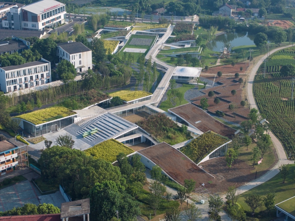 Situated in Xilong Township of Anji County, Zhejiang Province—an area renowned as one of China’s premier white tea-producing regions—the project occupies a previously unused plot on the edge of the tea fields near the town center. Originally, the site was designated for the construction of a White Tea Museum, as well as a museum for the nearby Paleolithic archaeological site of Shangmakan. In response, the building was conceived as two courtyard-based clusters extending between tea fields and a natural pond, with green roofs designed to merge the architecture seamlessly into the surrounding agricultural landscape.