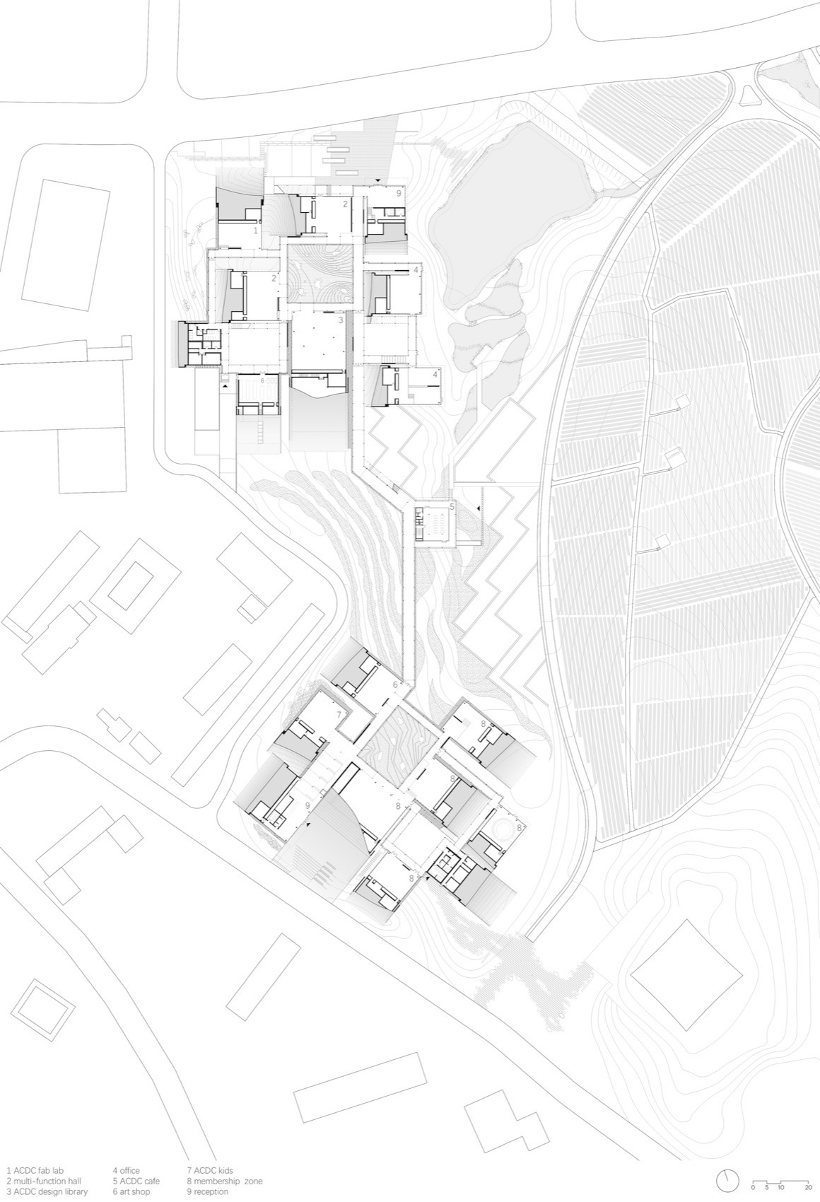 The layout of ACDC benefits from the original architectural strategy of flexible spatial distribution. Exhibition halls of various sizes are dispersed across the undulating terrain and connected by covered walkways. This approach allows the scattered-yet-connected clusters of exhibition halls, workspace, educational space, retail spaces, and tea rooms to serve multiple purposes: accommodating diverse forms of creative work, addressing different user groups, and supporting a range of thematic cultural events through both independent and shared programs.