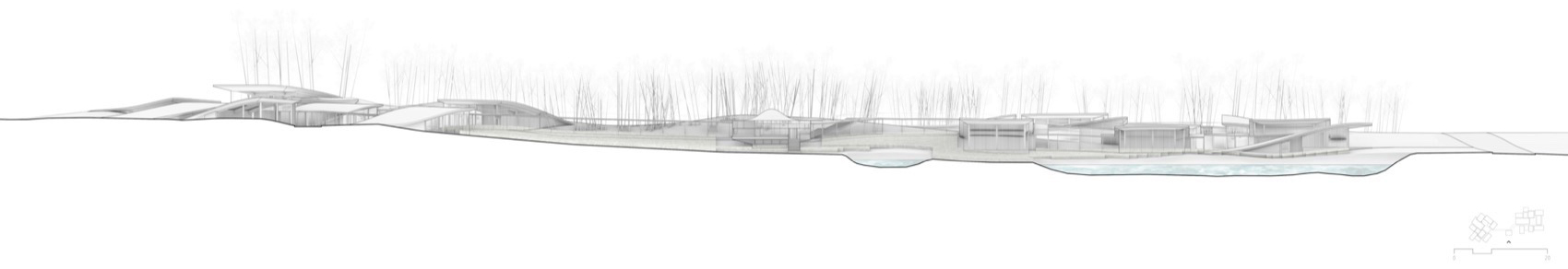 The undulating tea fields of Anji represent a human-made abstraction of natural topography—a unique kind of cultivated landscape shaped by the rhythm of tea planting. The architecture adopts a similar strategy. On plan, it follows an orthogonal grid reminiscent of an urban extension; yet in section, it mirrors and amplifies the site’s natural undulations. This dual gesture not only serves the building’s functional needs but also resonates with the hidden order of the original terrain, becoming a re-formation of the landscape itself. Together with the meandering tea fields, the architecture helps generate a new hybrid landscape on this land.