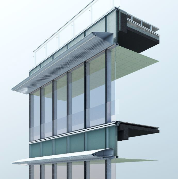 A smart facade system is implemented, with south-facing facades featuring adaptive shading louvers. This technology reduces