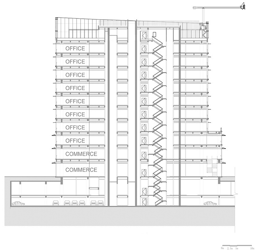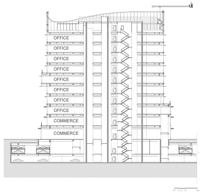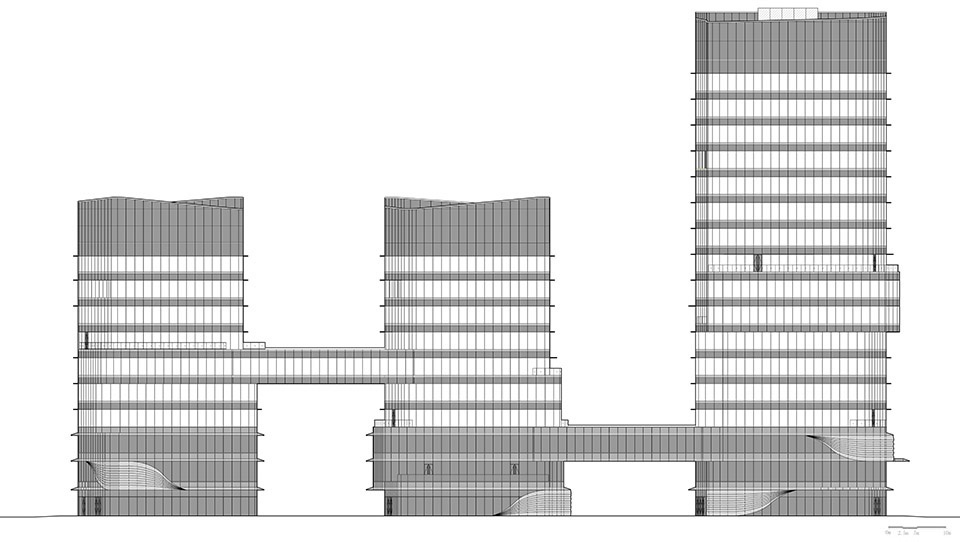 ▼幕墙采用横向错动的不锈钢波纹板,the facade features horizontally staggered stainless steel corrugated panels