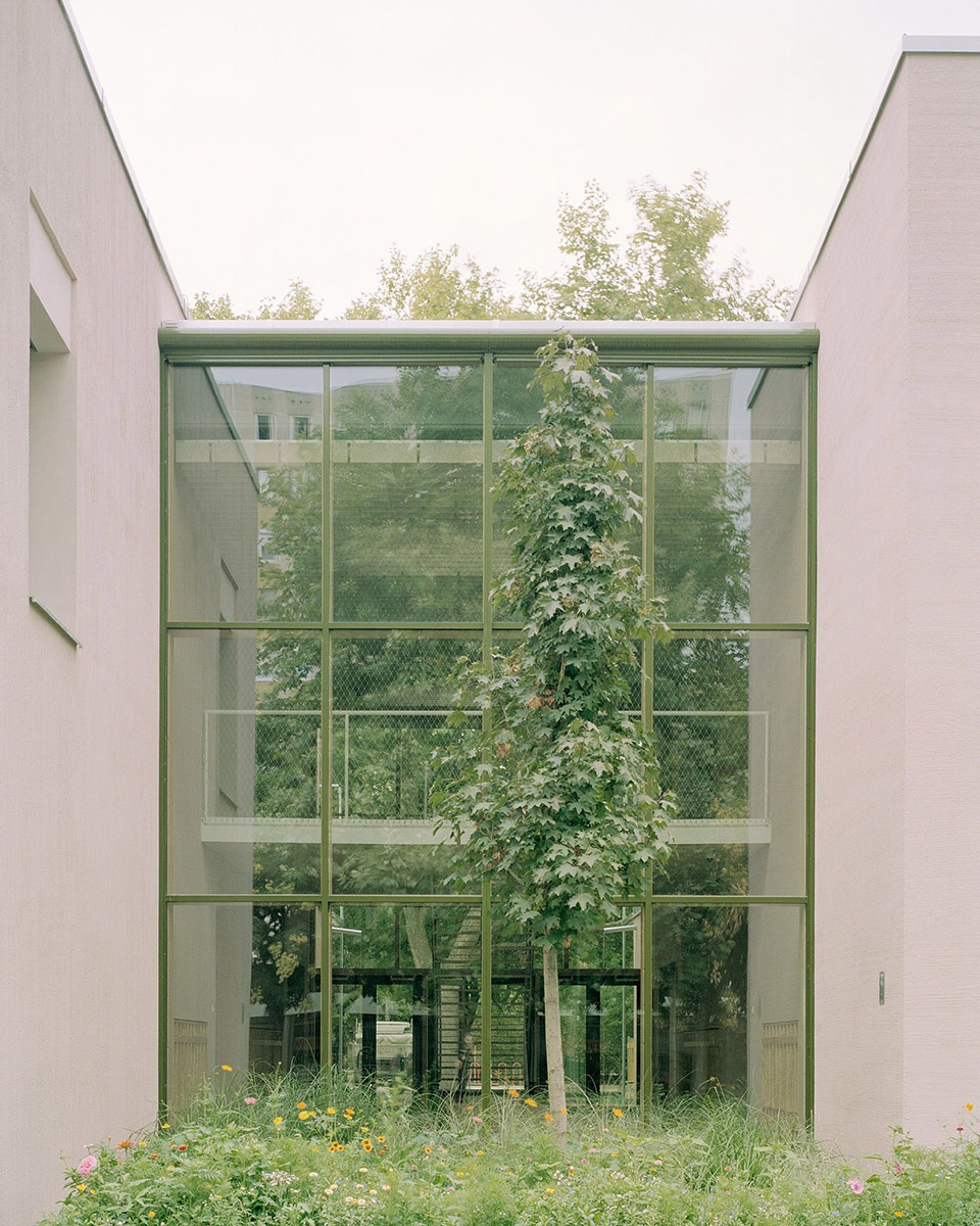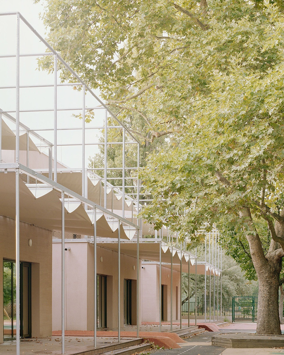 The existing building was retained, but a new floor was added – the two-storey sections have mezzanines, with connecting spaces for community activities, allowing interactions across the two floors. In addition to the ten classrooms, the development and activity rooms play a central role; providing space for movement, and creative activities, as well as cooking and developing individual and interpersonal skills as part of a healthy lifestyle education.