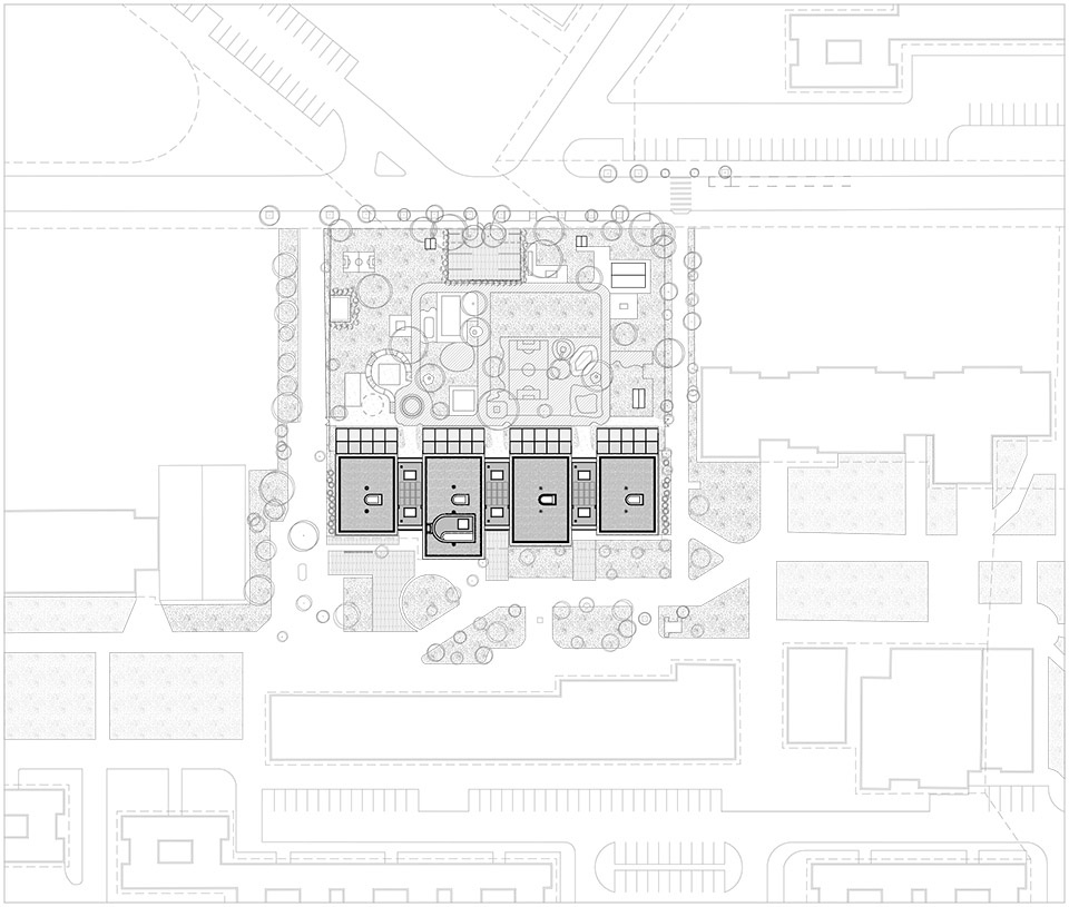 Built in the late 1970s, the ten-story prefabricated apartment blocks on Gyöngyösi Street surround a tree-lined green promenade with small-scale retail buildings, a nursery, a kindergarten, and a school, including Gyöngyszem Kindergarten. The existing building was a flat roof single-story, flat-roofed, prefabricated paneled house with a central corridor.