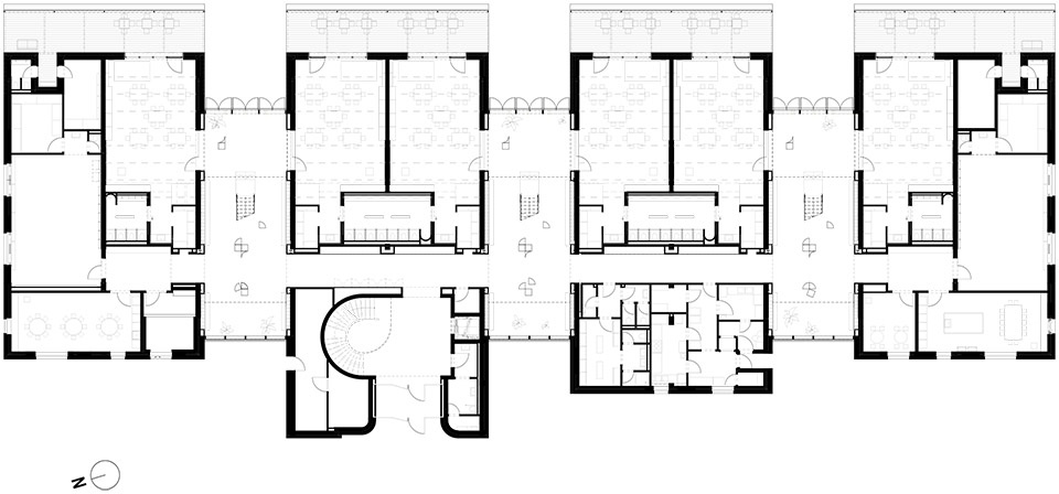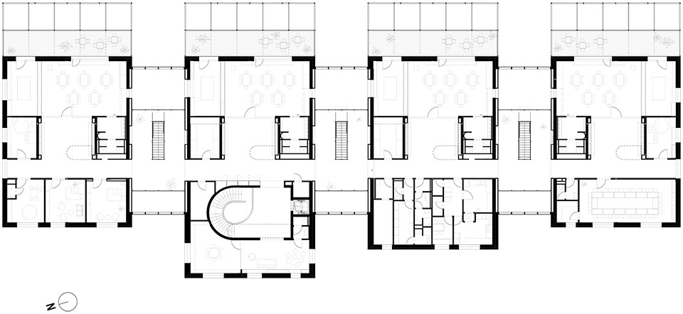 在保留原有建筑的基础上,新增了一层楼。双层结构中设有夹层,并引入了联通空间,便于开展社区活动,实现两层之间的互动交流。除了十间教室外,发展与活动室也扮演着重要角色:它们为运动、创意活动、烹饪以及个体与人际能力的发展提供空间,并融入健康生活方式的教育理念。