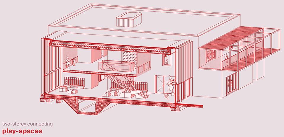 夹层通过楼梯通往庭院,连接至受儿童游戏积木形状启发而设计的趣味性家具。