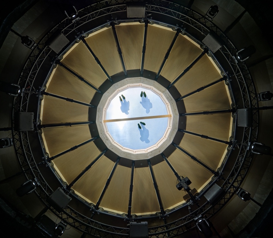The final chapter of the exhibition and the visitor’s imaginary journey through the pavilion is the staircase from the observation deck back down to the ground. It is set into the cavity of the double walls of the cylinder, which lead to the ground floor with a restaurant where people can enjoy Czech gastronomy. Next to the visitor staircase from the observation deck to the ground floor, a second staircase winds through the inner tube and serves as an auditorium. The staircase connects the auditorium stands, the restaurant on the ground floor and the VIP lounge. The ingenious composition of the two staircases ensures a clear separation of the exhibition and multifunctional hall operations. Wheelchair access is provided by a lift in the western part of the building.