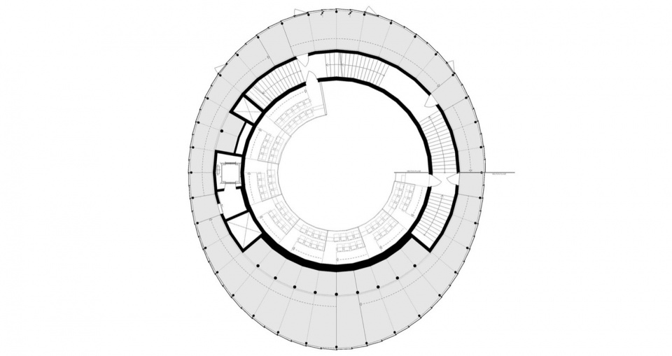 参观路径围绕中心的多功能厅——展厅的圆柱形结构盘旋而上。这个直径15.5米、内部高度达12米的空间将用于文化演出、讲座等多种活动,设计上采用黑盒子形式。展厅中的坡道座位延续了观展路径的边缘线,并与画廊路径在多处相连,使得两者可根据需要灵活连接或隔离。