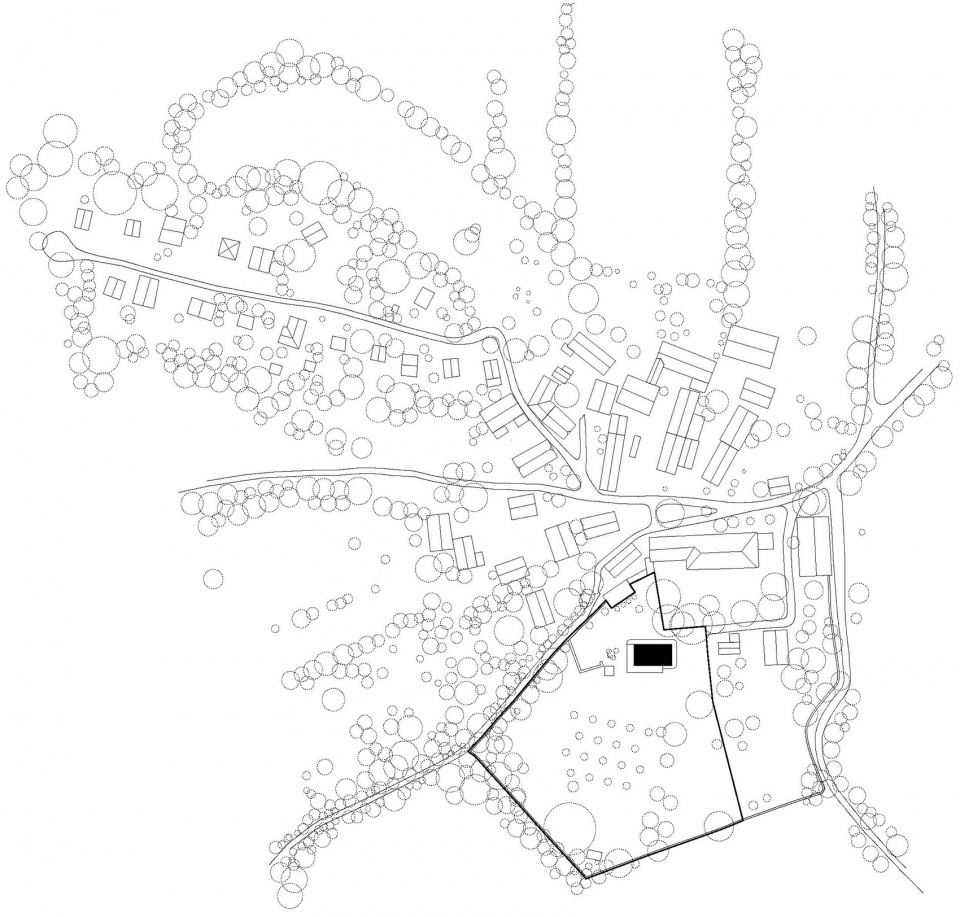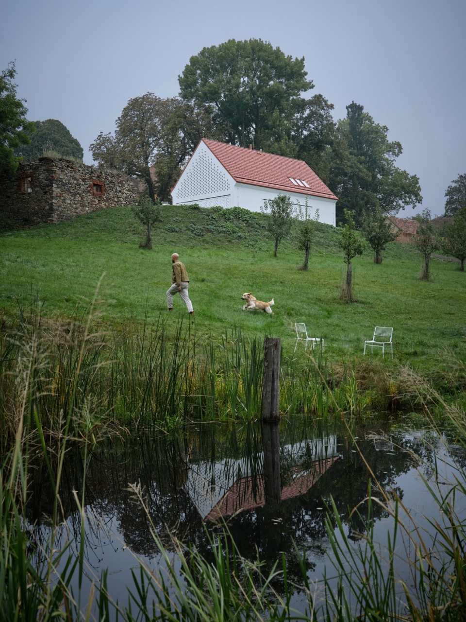 The House Oskar, designed by architect Jan Žaloudek, was built in a generous garden that originally belonged to the neighbouring chateau in the South Bohemian village of Kamenná Lhota. The site’s remarkable genius loci is enriched by the remnants of a Baroque barn, centuries-old mature trees, and a stone wall that frames the expansive property, opening into the picturesque rural landscape.