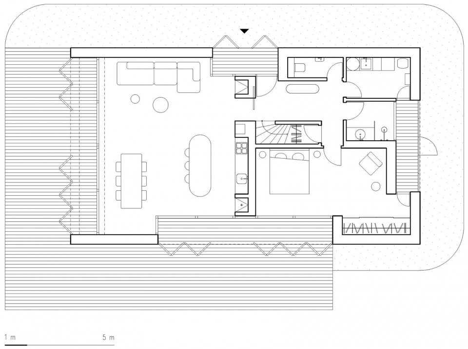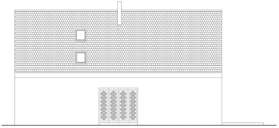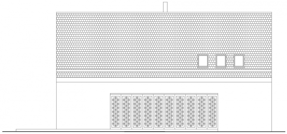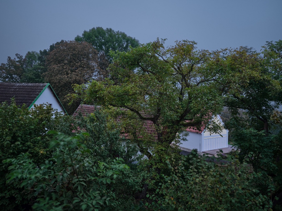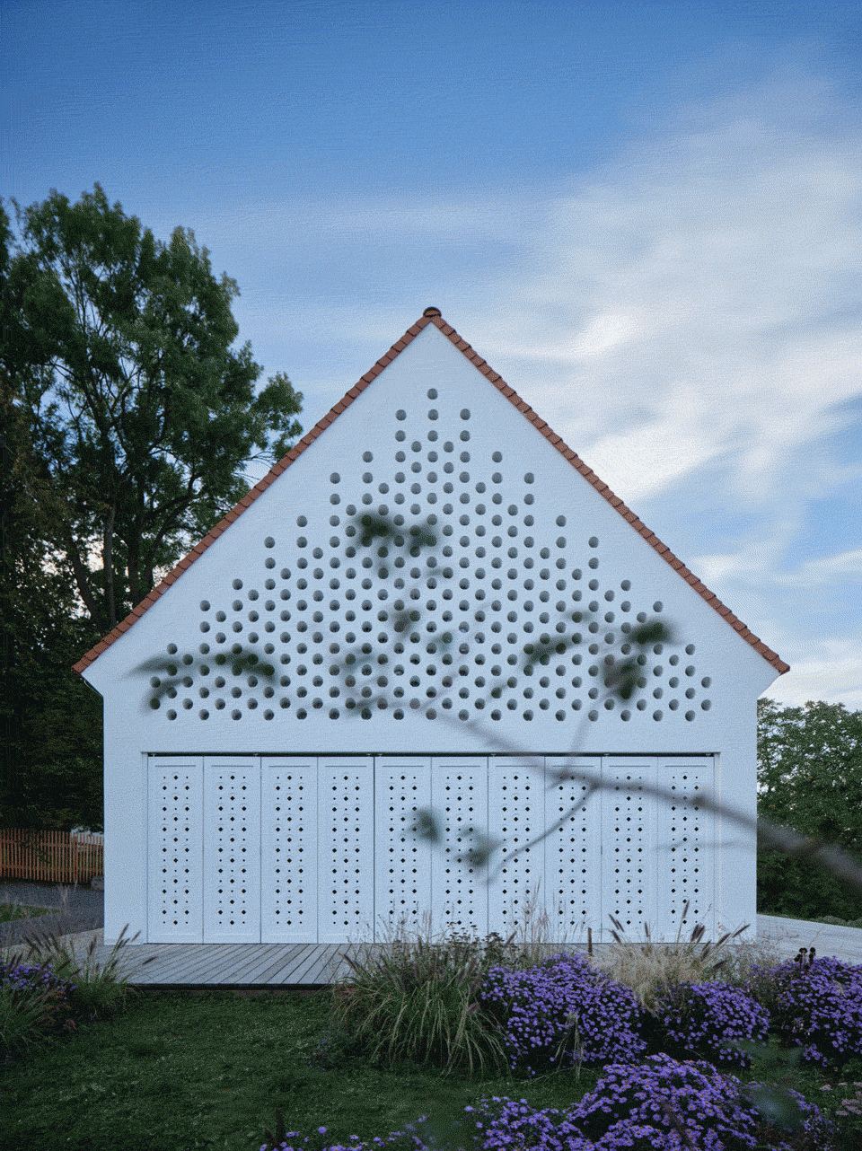 The design respects the traditional elongated form of houses with gabled roofs, drawing on the vocabulary of local agricultural buildings. Perforated masonry, with openings for light and air found in nearby historical structures, serves as the building’s defining feature. This detail acts as a sunshade for the southern gable wall and inspires the pattern of wooden shading panels on the other façades. The compact form of the house is permeated by niches on each façade—references to Baroque morphology. These niches form entry vestibules and loggias, allowing flexible shading. The house can either fully open to the landscape, connecting its residents to the world, or close off to highlight its meditative character.