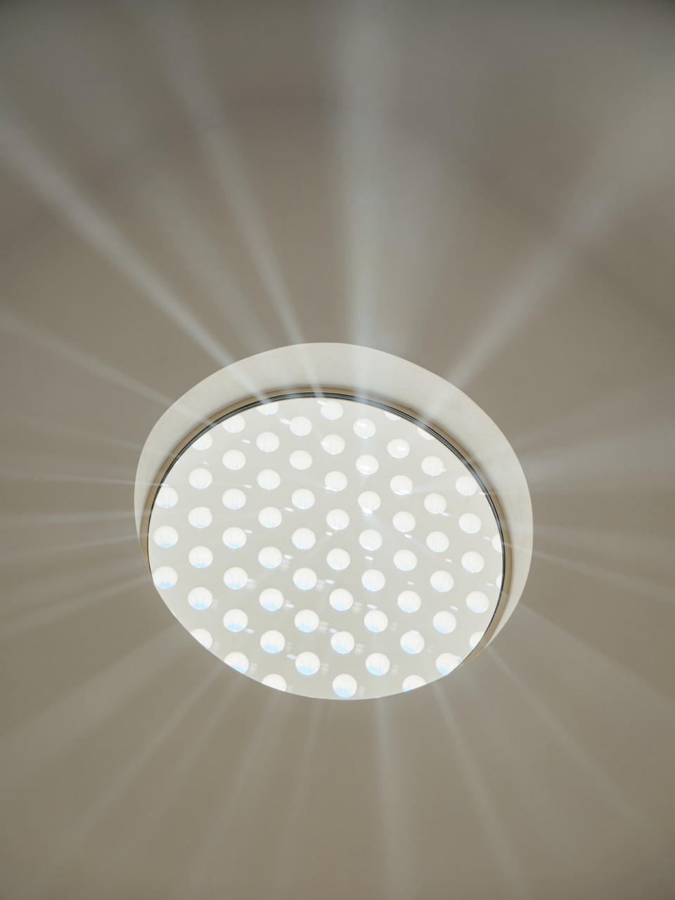 白色遮阳板可在一天之中调节阳光渗透。阳光充盈的房间可瞬间变为光影交错、充满魔幻氛围的静谧空间。夜晚来临时,光线方向反转,住宅透过发光的壁龛向外照亮乡村。室内使用极简主义白色灯具,并以日本和纸灯笼和壁炉跳跃的火光补充照明。