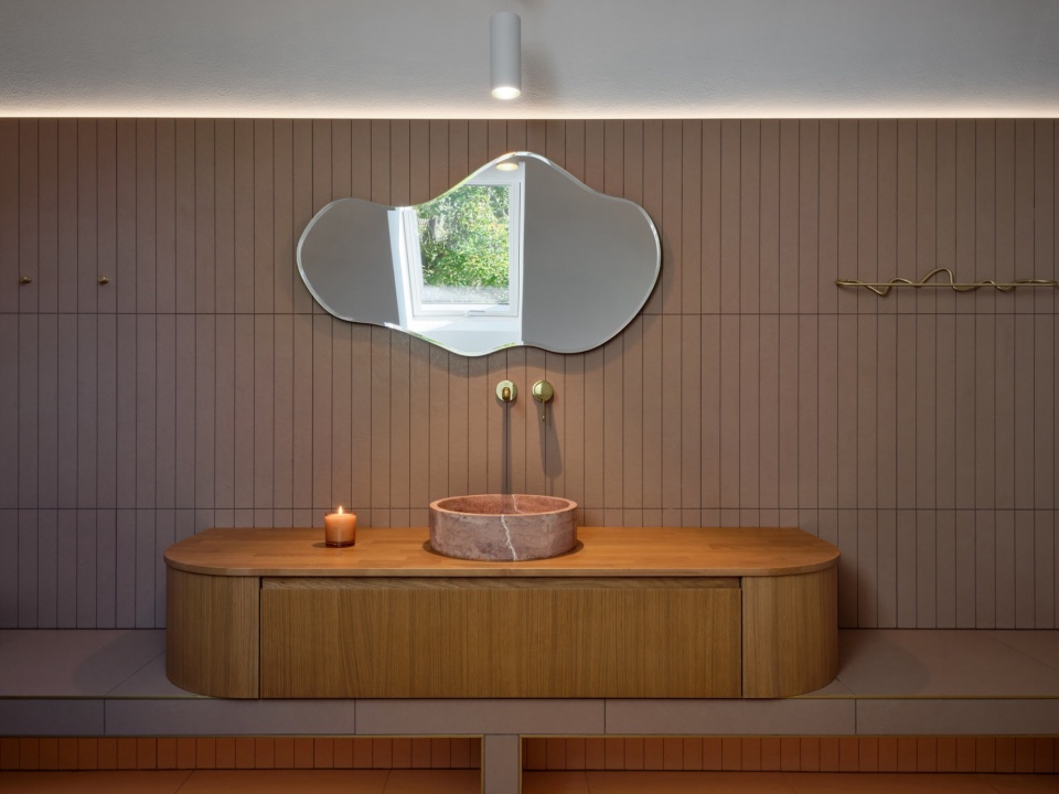 除主起居空间外,地面层还包括浴室、卫生间、辅助房间和一间卧室。全屋配备由建筑师设计的定制木制与石材家具,包括实木床、衣柜、玄关处的黑色花岗岩长凳及床头柜。