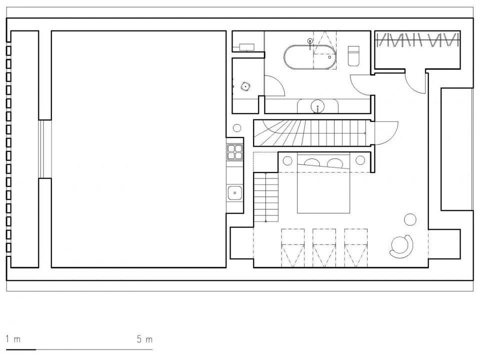 The upper floor is conceived as a separate apartment with a bedroom, bathroom, and studio space. Unlike the ground floor, which maintains an open connection to the outside world, the attic is a closed, cocoon-like space ideal for reflection, reading, and creation. Small roof windows illuminate the white, compact cavern permeated by niches and arches.
