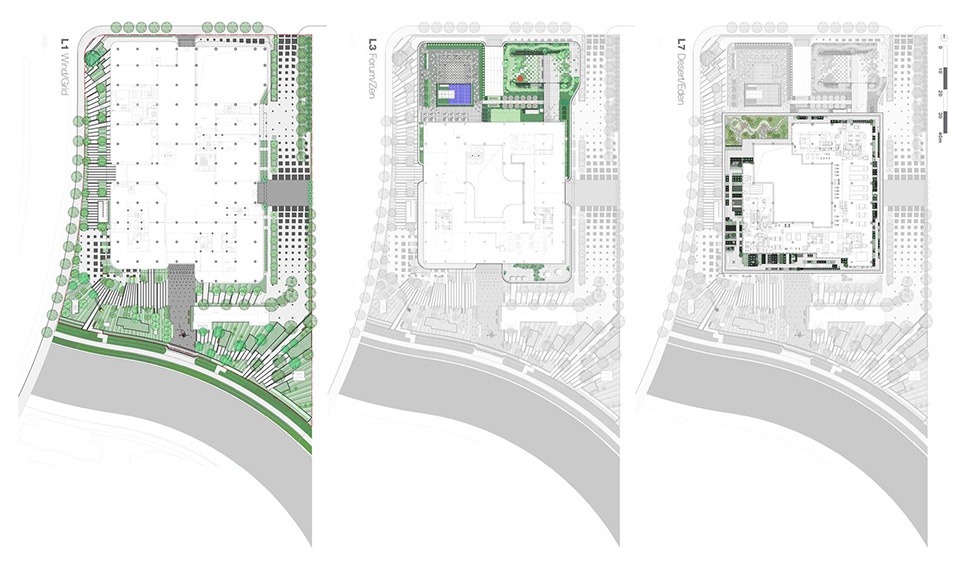 The podium hosts the main social and collaborative functions of the building. It is divided into four quarters and connected along the north-south and east-west direction through atria.The design aims to create an “urban living room” that enhances the laboratory’s integration into the city.