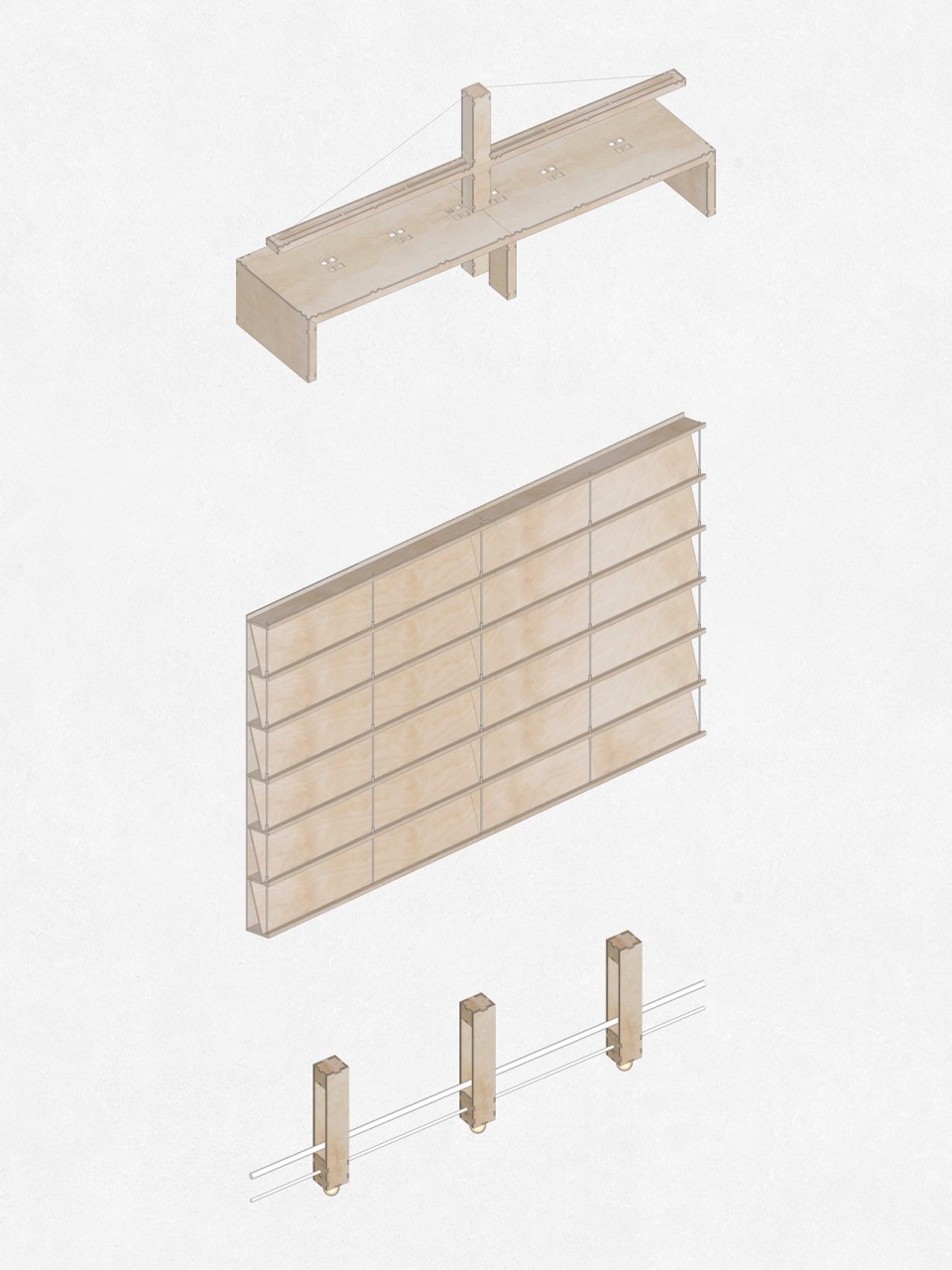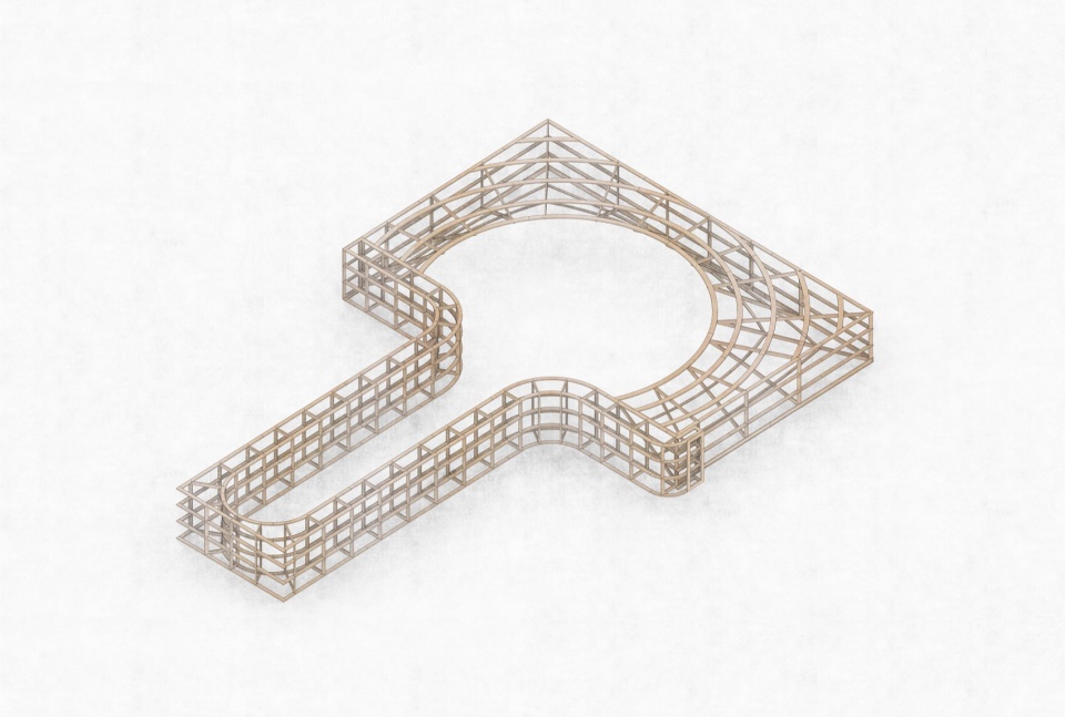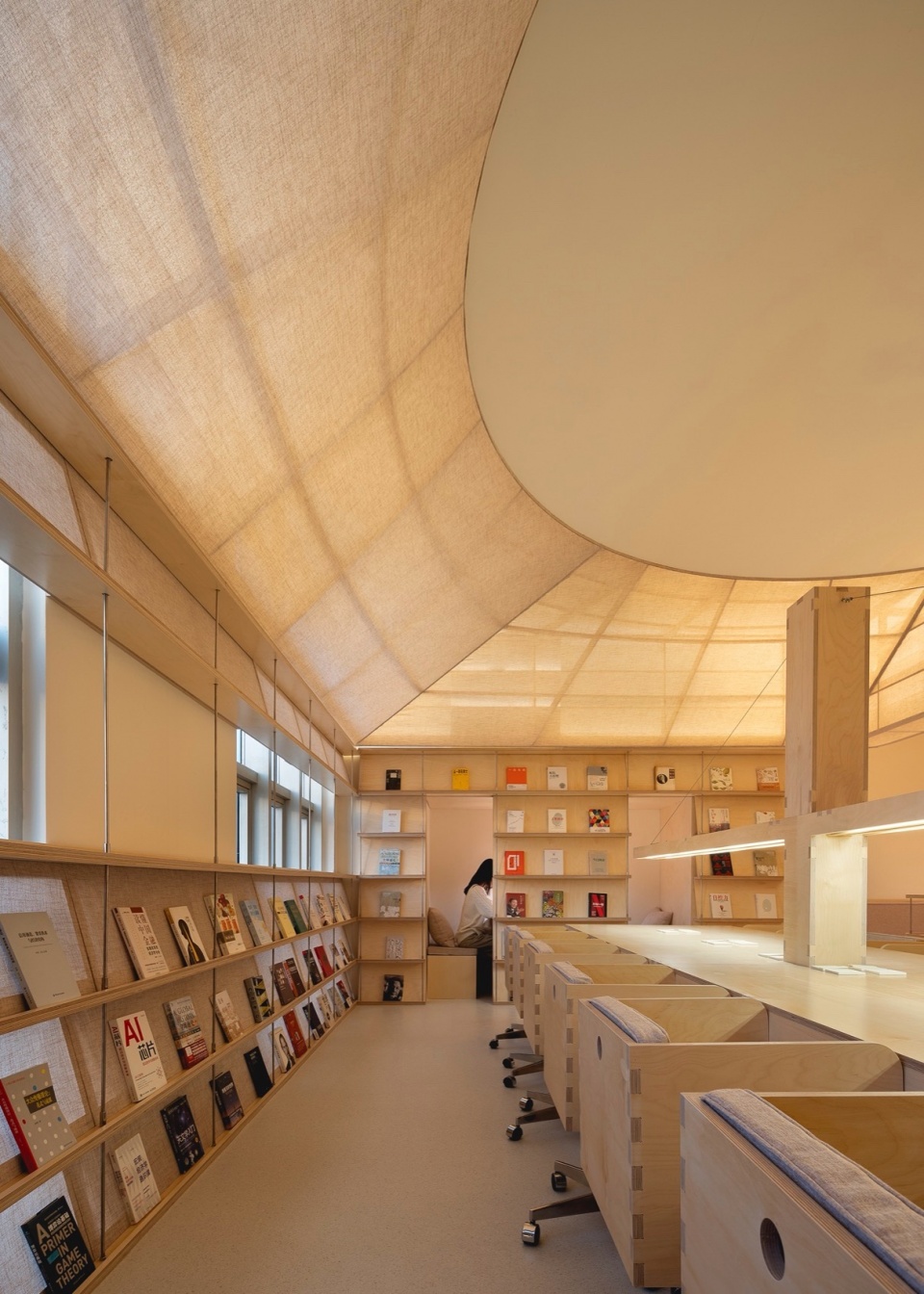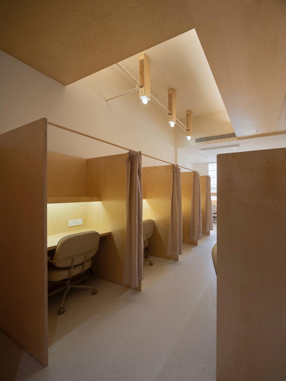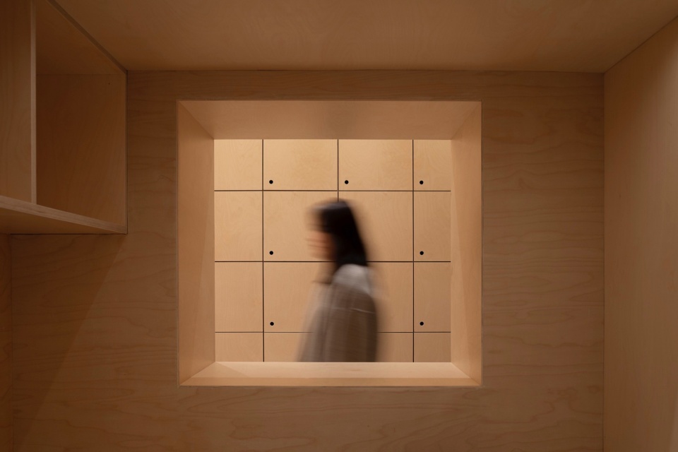 A floating lantern-like installation serves as a spiritual totem of the space, hovering quietly overhead. Digitally designed and crafted from birch plywood, it features finely detailed mortise and tenon joints. Its wooden framework is hidden behind fabric, faintly visible, breathing with rhythm as light passes through. During the day, sunlight gently filters through the gaps in the wood and fabric, casting richly layered shadows across the desks—agile and poetic. At night, warm light seeps through semi-transparent curtains, tinting the ceiling with a soft glow, like a floating dream. This suspended lighting fixture is not just a functional illumination system but a spiritual symbol of the space. Its shadow projection transforms gradually from solid to ethereal over a 12-hour solar cycle.