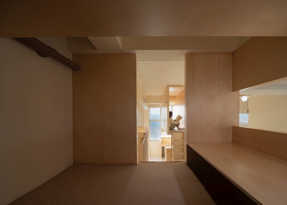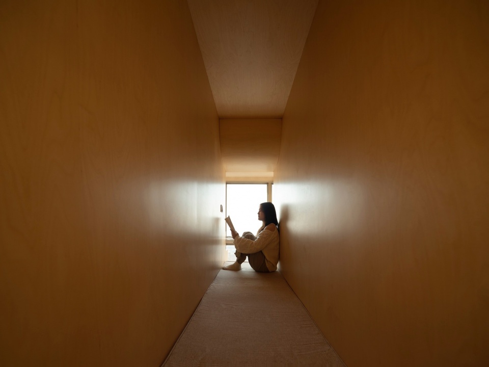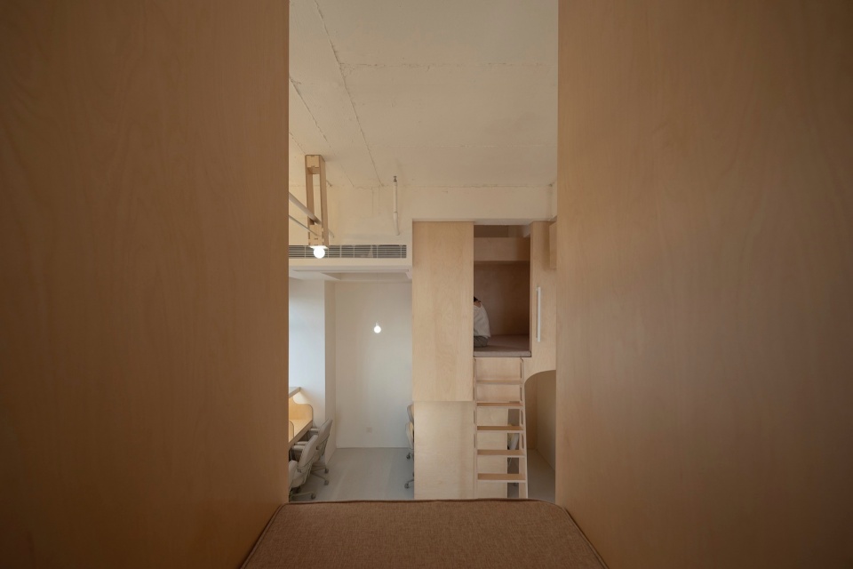 Vertically, we designed an engaging climbing path, placing stacked functional zones in areas with minimal overhead obstructions. Multiple three-dimensional boxes are interspersed within the study zone, increasing usable space while enriching the spatial experience. Climbing the ladder leads one to a spiritual realm—the meditation pod. This capsule-like space accommodates both lying and sitting, and features a transparent retractable desk at the far end, allowing users to gaze over the city’s veins from high above, experiencing a profound sense of detachment and perspective.