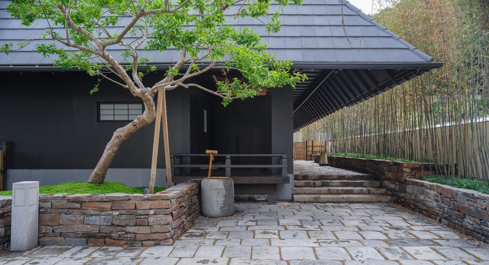 入口设置点景树,下方是细腻的绿色“绒毯”,加之起伏的微地形更添一丝韵味。入口两旁是由景石堆砌的矮墙,石块错落咬合简约大气。石墙旁单独矗立着天然景石,镌刻有“见山本院”,彰显主入口的仪式感。