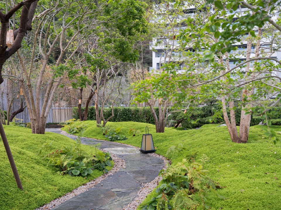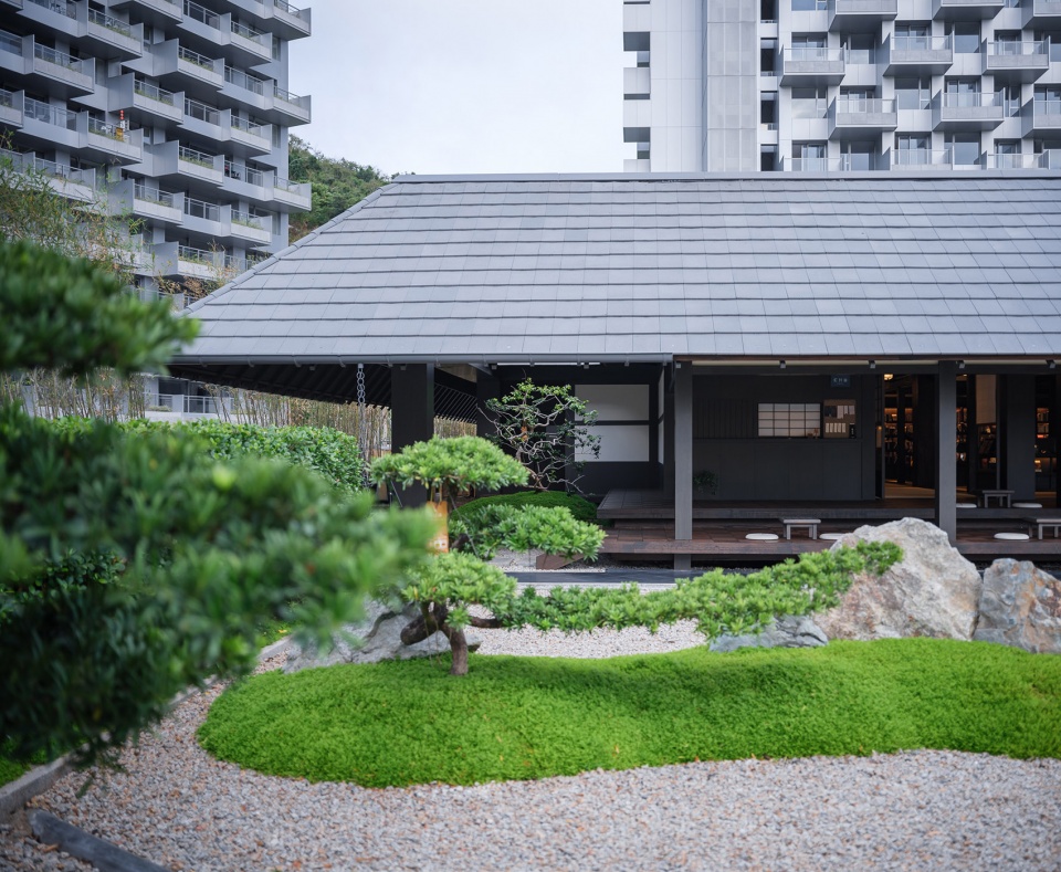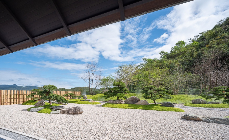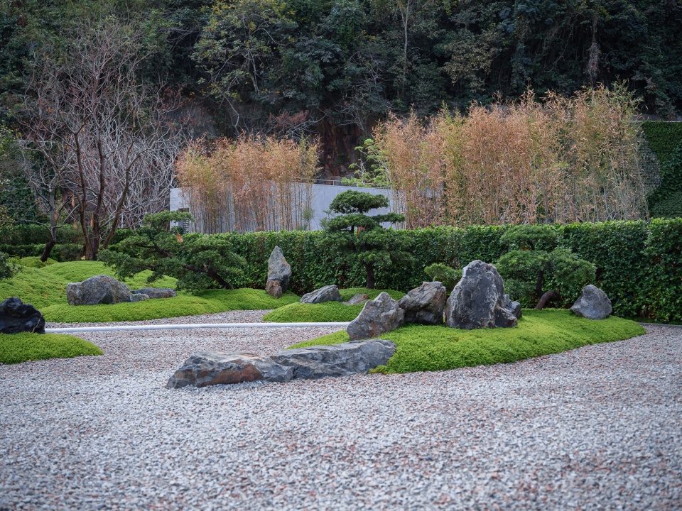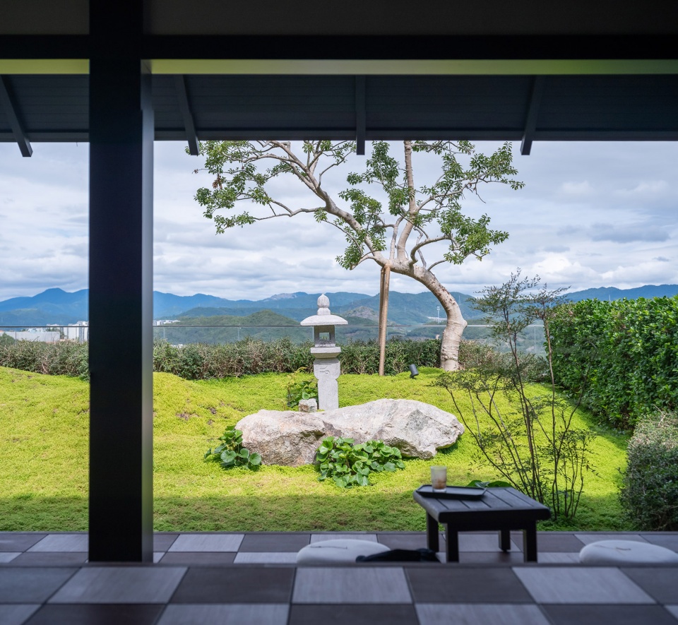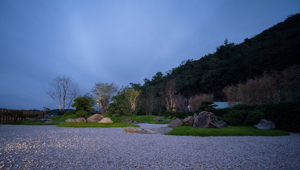 九山之庭的精髓在于“借景”,将远处的层峦叠翠为我所用。眼前的起伏地形与远处的连山融为一体,不分你我。“檐廊静坐,眼前是小山,石草相偎,石灯独守。抬眸,见远山层层叠叠;天地间,皆成诗画,树语灯明,心渐归宁。”