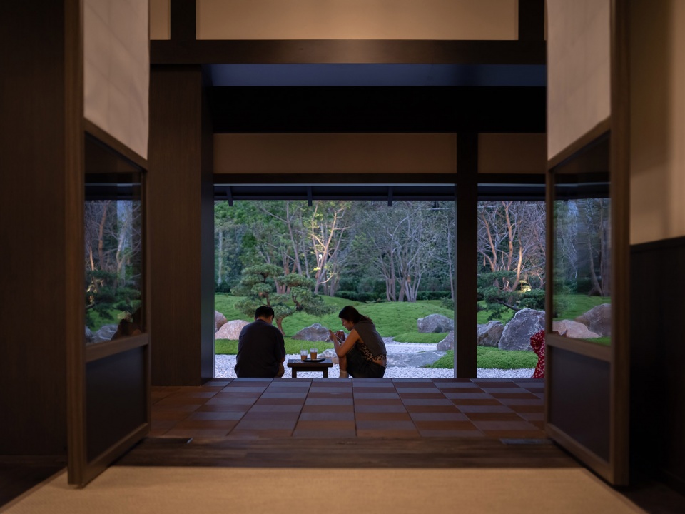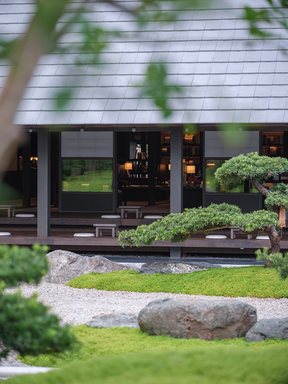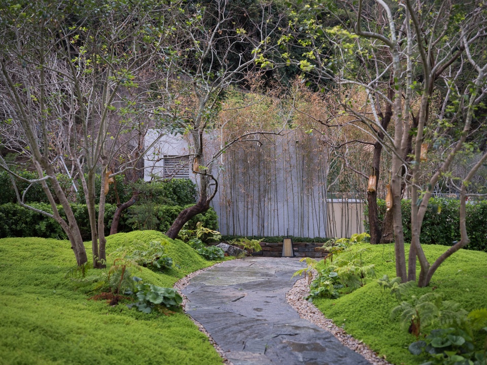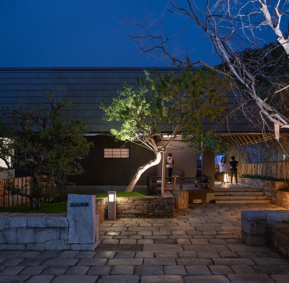 九山之庭的精髓在于“借景”,将远处的层峦叠翠为我所用。眼前的起伏地形与远处的连山融为一体,不分你我。“檐廊静坐,眼前是小山,石草相偎,石灯独守。抬眸,见远山层层叠叠;天地间,皆成诗画,树语灯明,心渐归宁。”