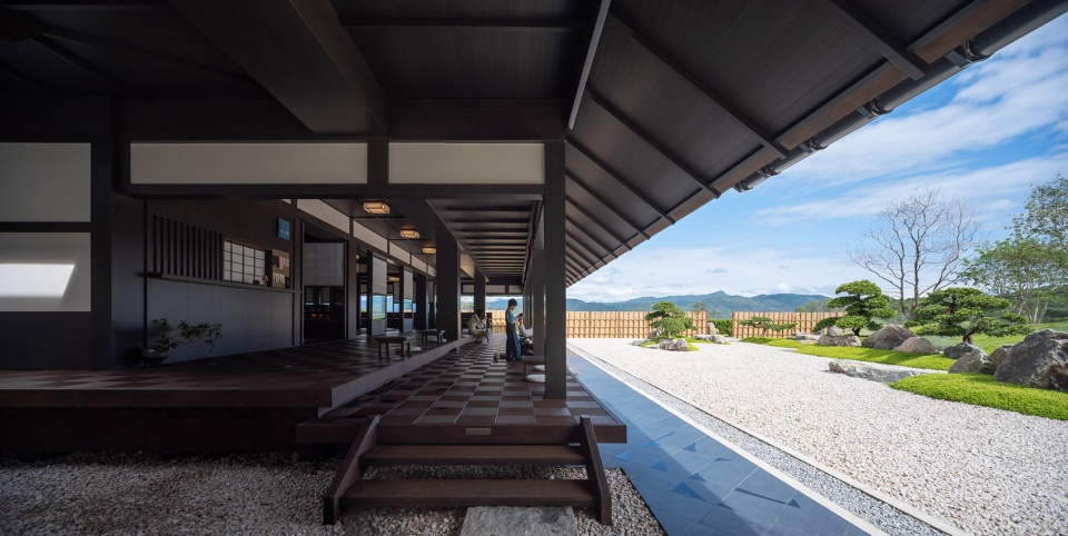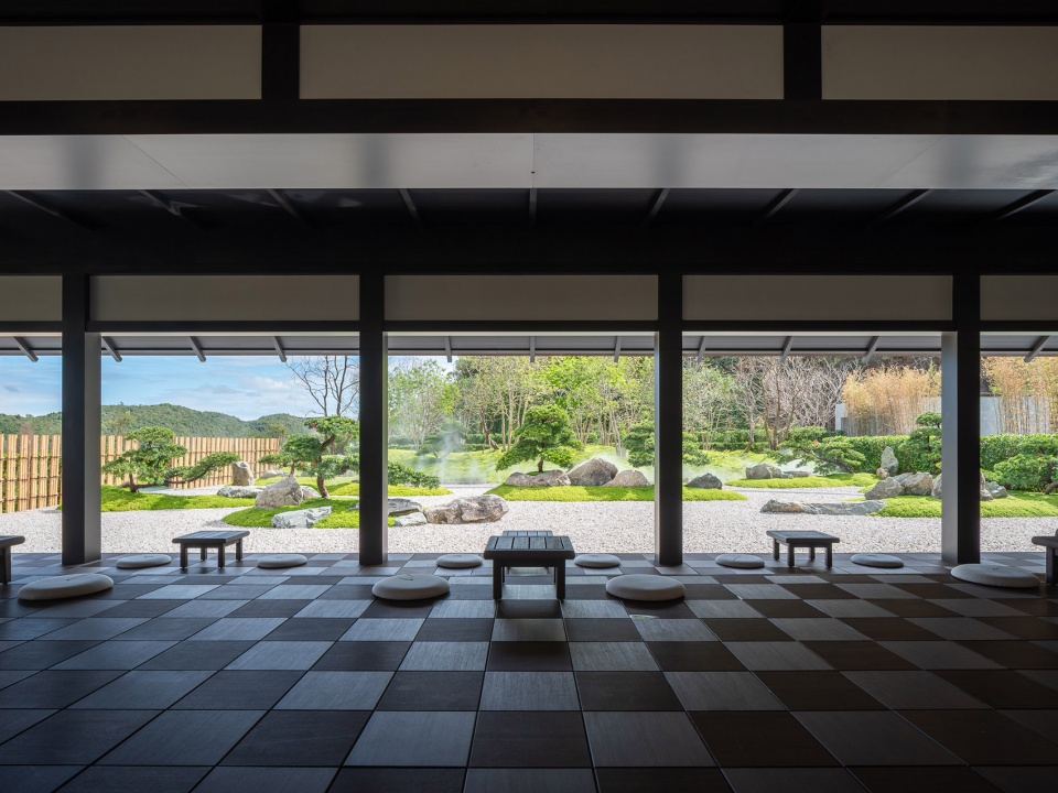 一根弧线将庭院一分为二,建筑的一侧是“此岸”,另一侧是“彼岸”。砾石中一块像小船一样的景石,象征着往来于彼岸与此岸之间的普渡慈航,给人们带来幸福安康。