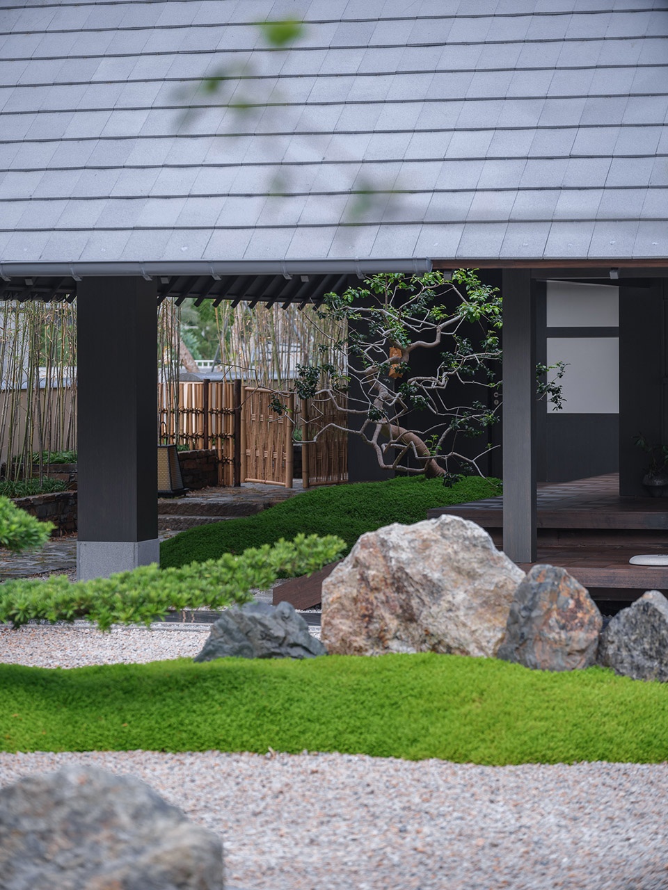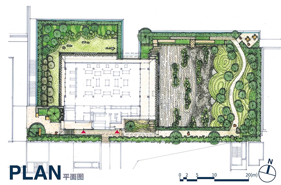 见山本院是客人来寻求自我、放松发呆的心灵归宿——“枕上读书闲趣多,窗前看景雨来佳”。虽然用地不大,但要有足够的气韵来承载客人们的“心绪”——“山旁一院容万物,海上千帆过九洲”。砾石象征大海,分散的绿岛象征九洲,造型罗汉松象征风帆。